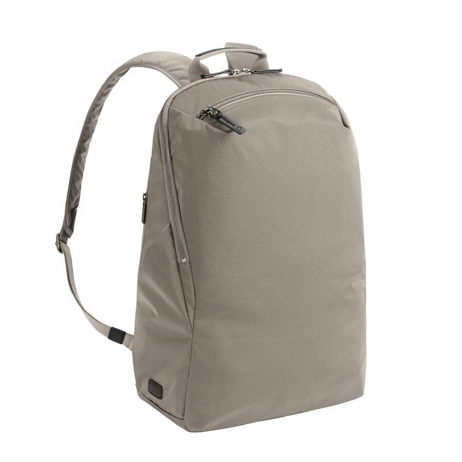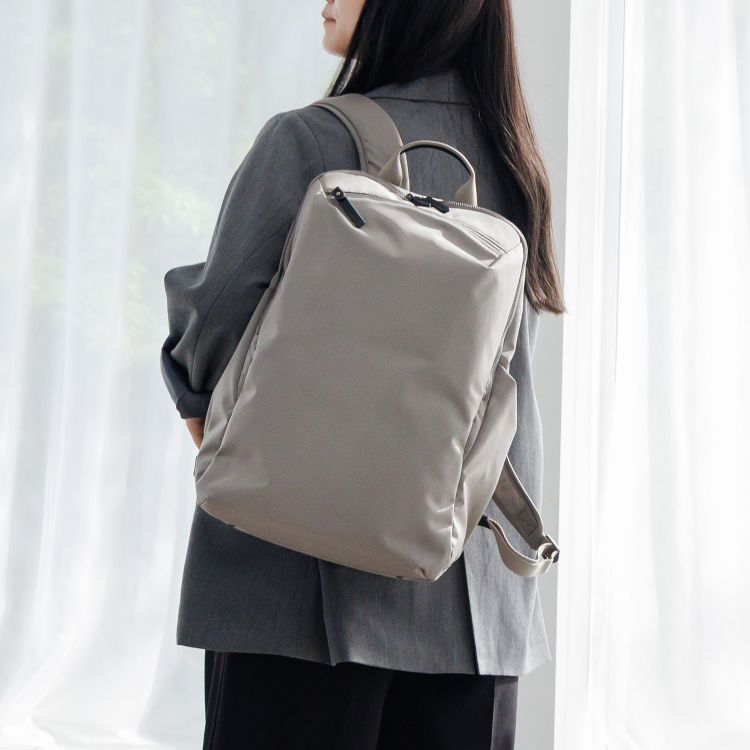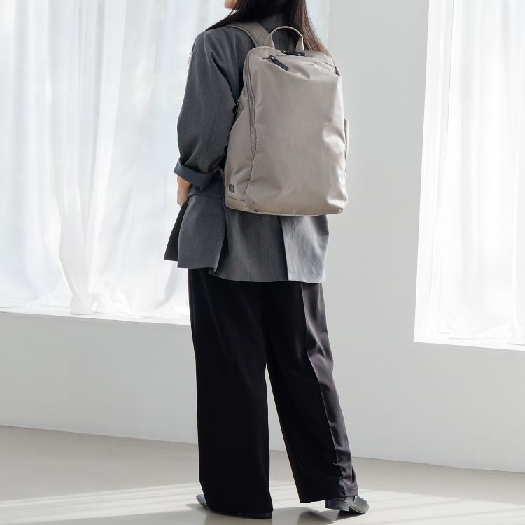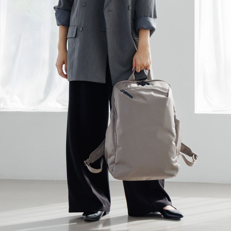 薄暗い場所でも荷物を見つけやすいよう、明るいグレーのストライプ生地をメイン気室、フロントポケットに採用。