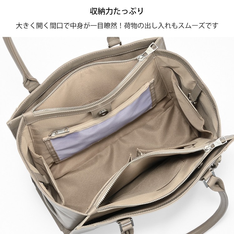 大きく開く間口で中身が一目瞭然。内装にはたくさんのポケットが付いているので、荷物を心地よく収納できます。