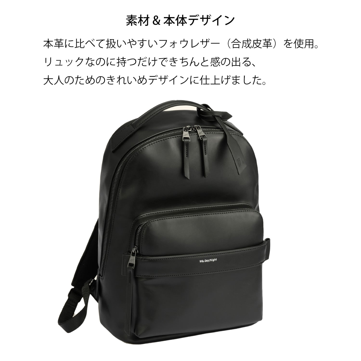 そんな要望にお応えすべく、本革に比べて扱いやすいフォウレザー(合成皮革)を使用した通勤リュックです。