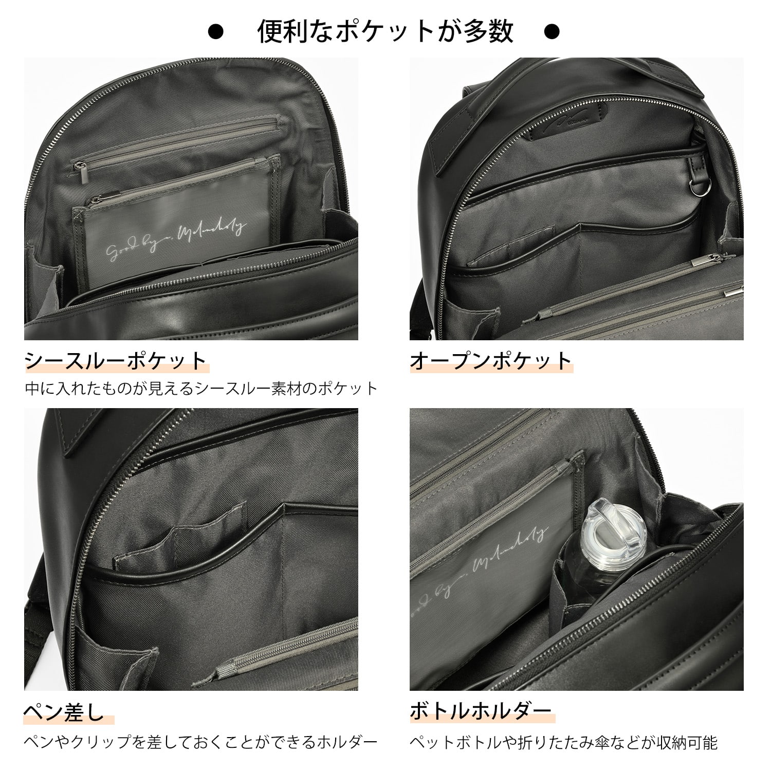 コーディネートを選ばないミニマルデザインながら、充実のポケットやボトルホルダーなど、W&.Day/Nightらしい収納の工夫が満載のリュックです。