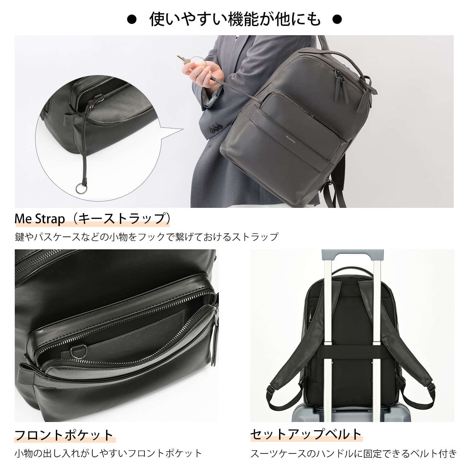 | 機能一覧 | A4ファイル収納/タブレット収納(11.0inch)/シースルーポケット/他ポケット多数/Napping pl.(スマートフォンポケット)/Me Strap(キーストラップ)/セットアップ機能 |