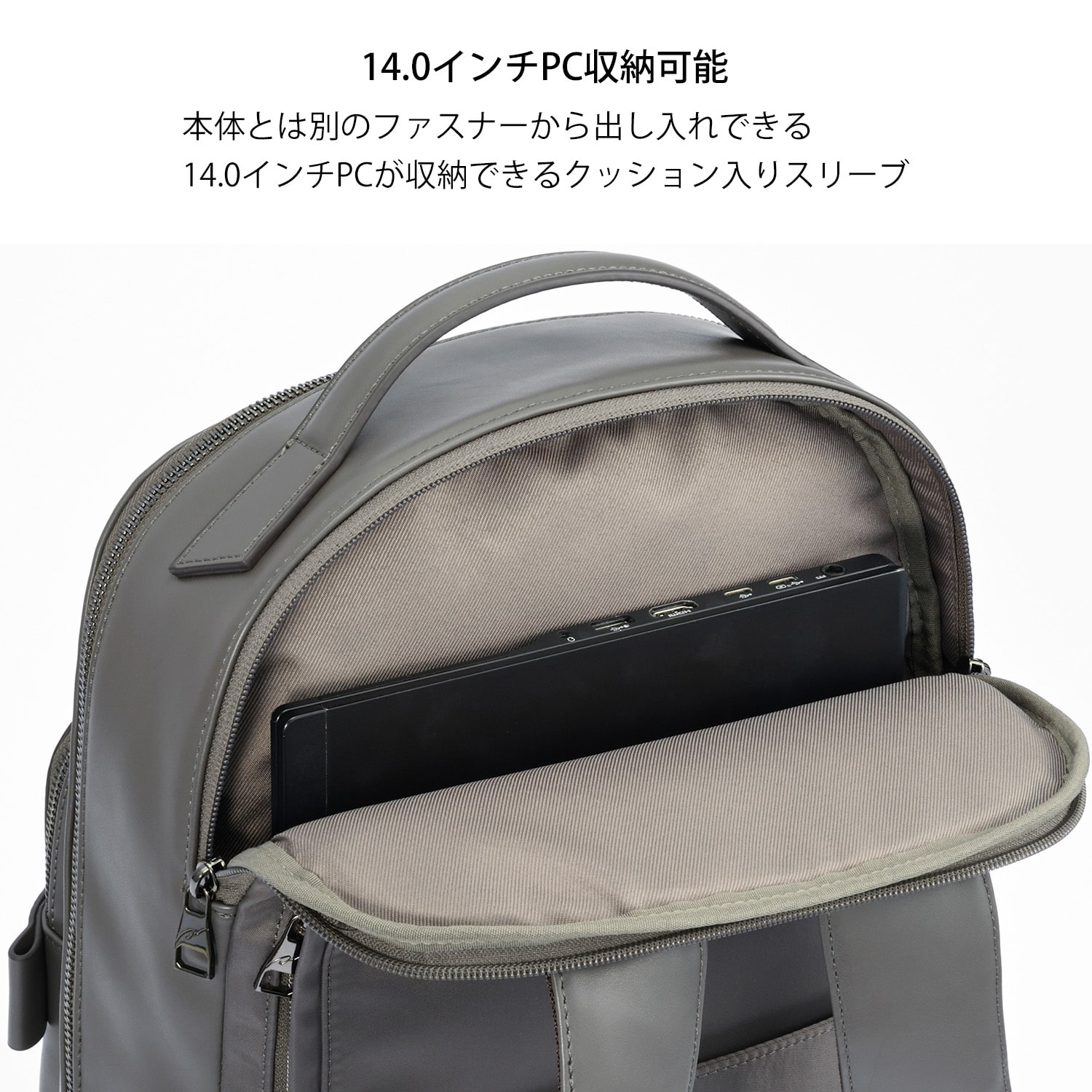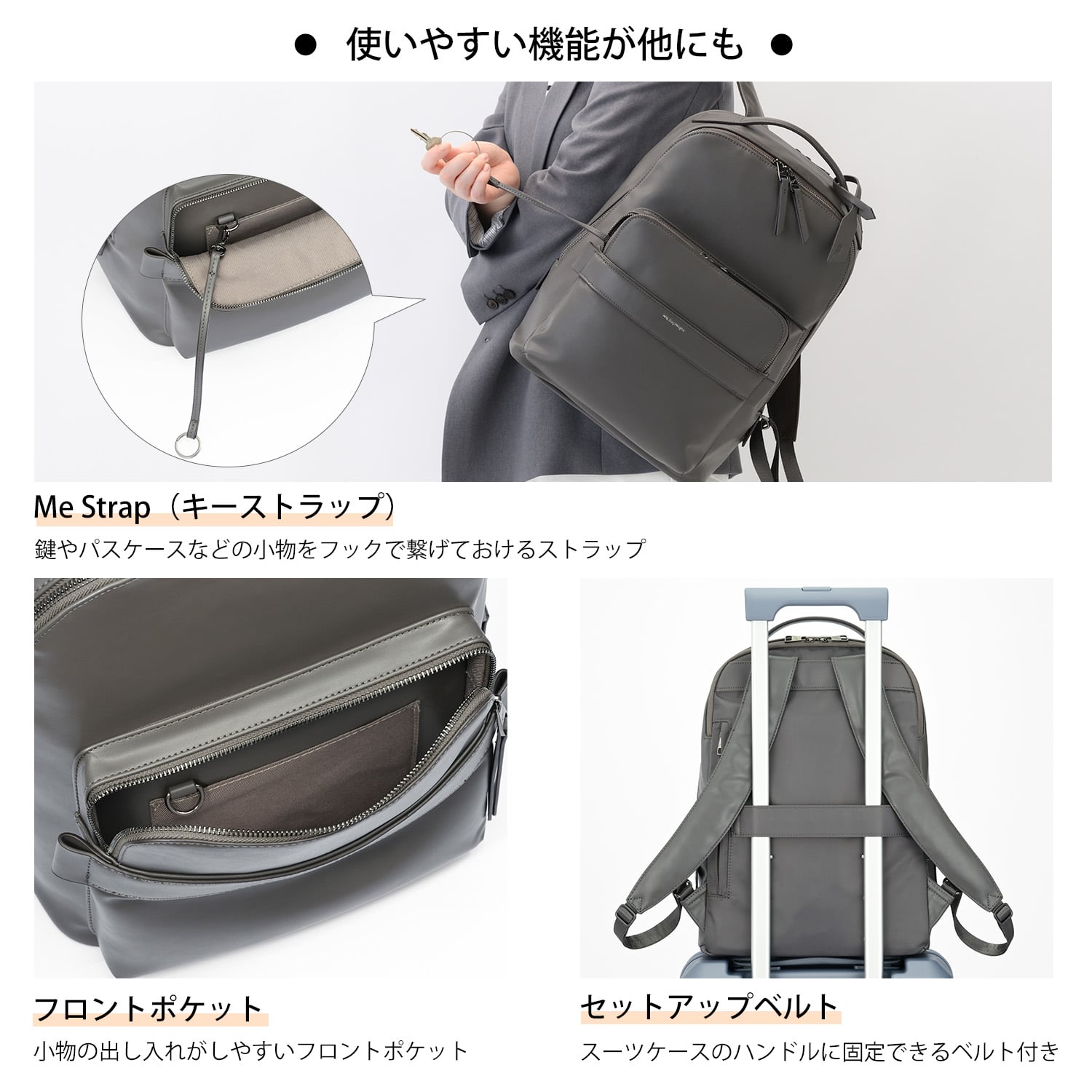 | 機能一覧 | 2気室/A4ファイル収納/PC収納(14.0inch)/シースルーポケット/他ポケット多数/Napping pl.(スマートフォンポケット)/Me Strap(キーストラップ)/セットアップ機能 |