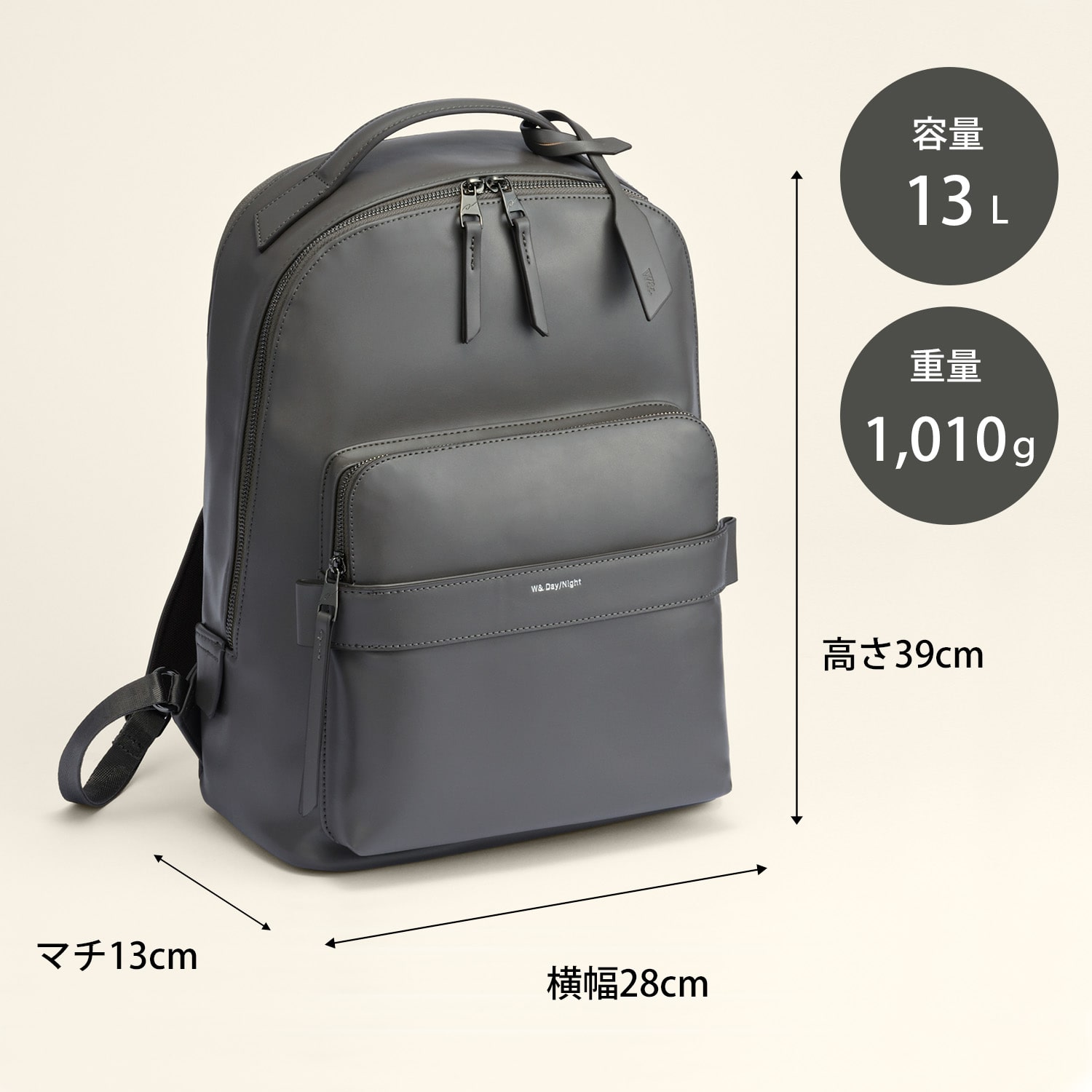 コーディネートを選ばないミニマルデザインながら、充実のポケットやボトルホルダーなど、W&.Day/Nightらしい収納の工夫が満載のリュックです。