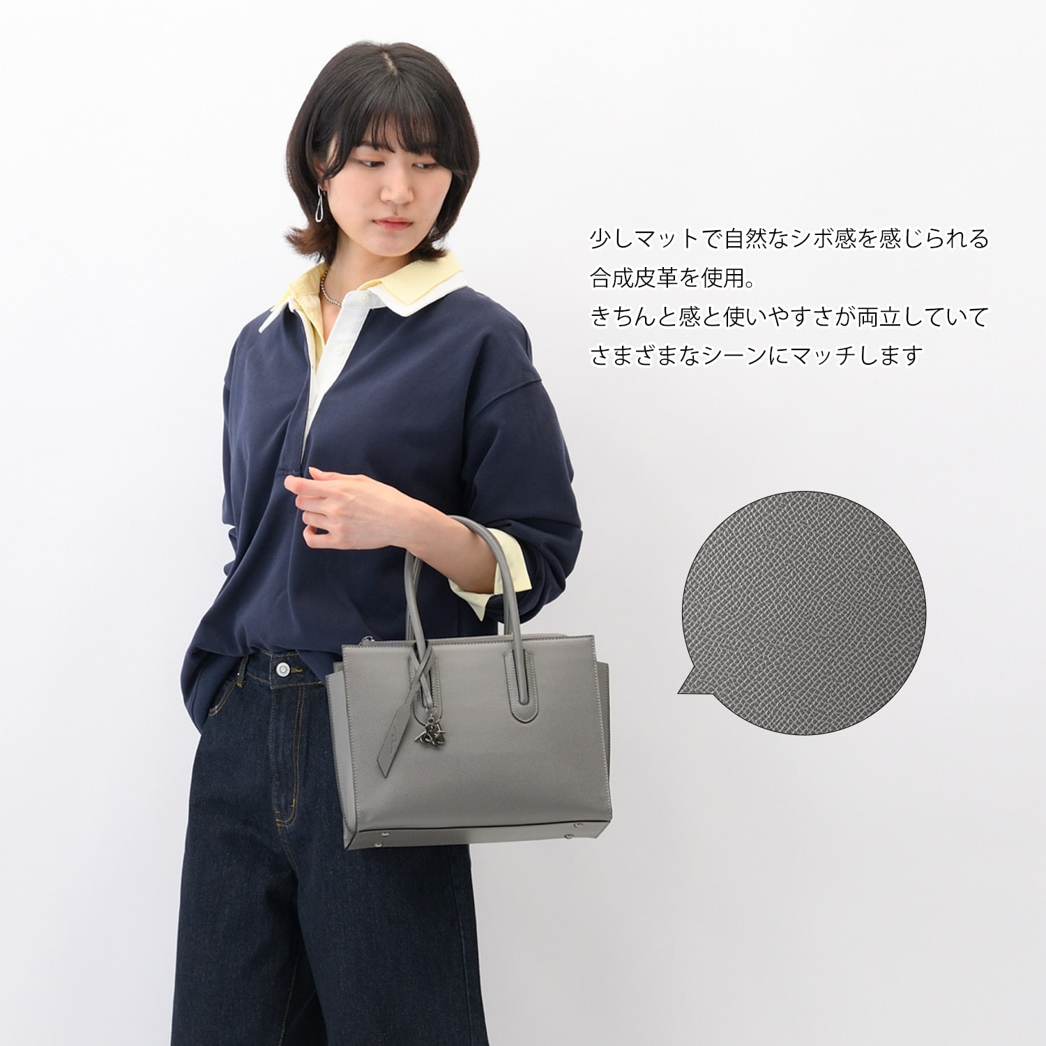 きちんと感と使いやすさを両立させるために、軽くて扱いやすい合成皮革を使用。