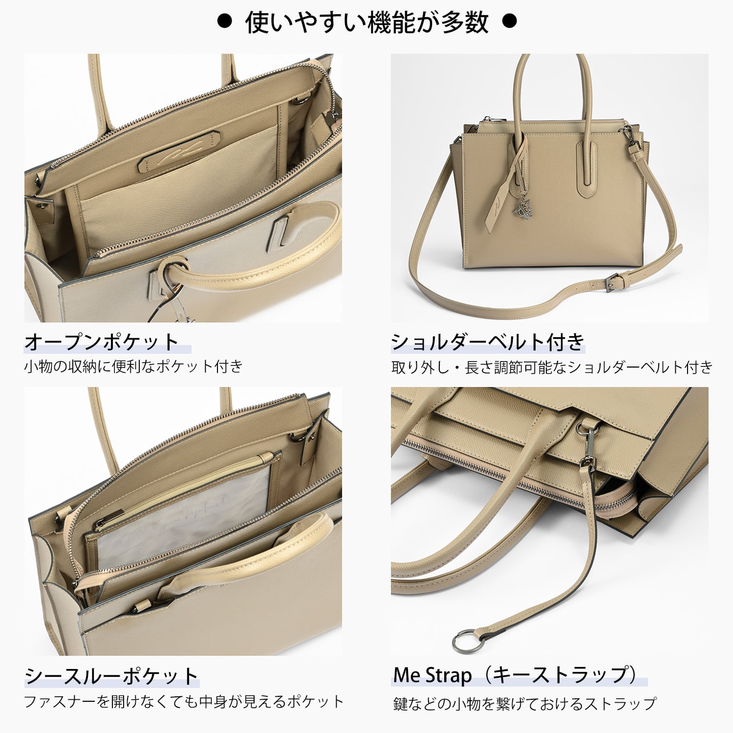 | 機能一覧 | B5ファイル収納/シースルーポケット/Napping pl.(スマートフォンポケット)/Me Strap(キーストラップ)/ボトルホルダー付属/ショルダーベルト付属 |