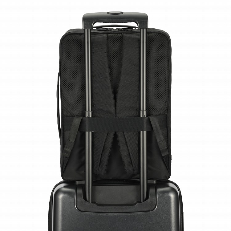 リュック背面へはスーツケースのハンドルに固定可能なセットアップベルトを設置。