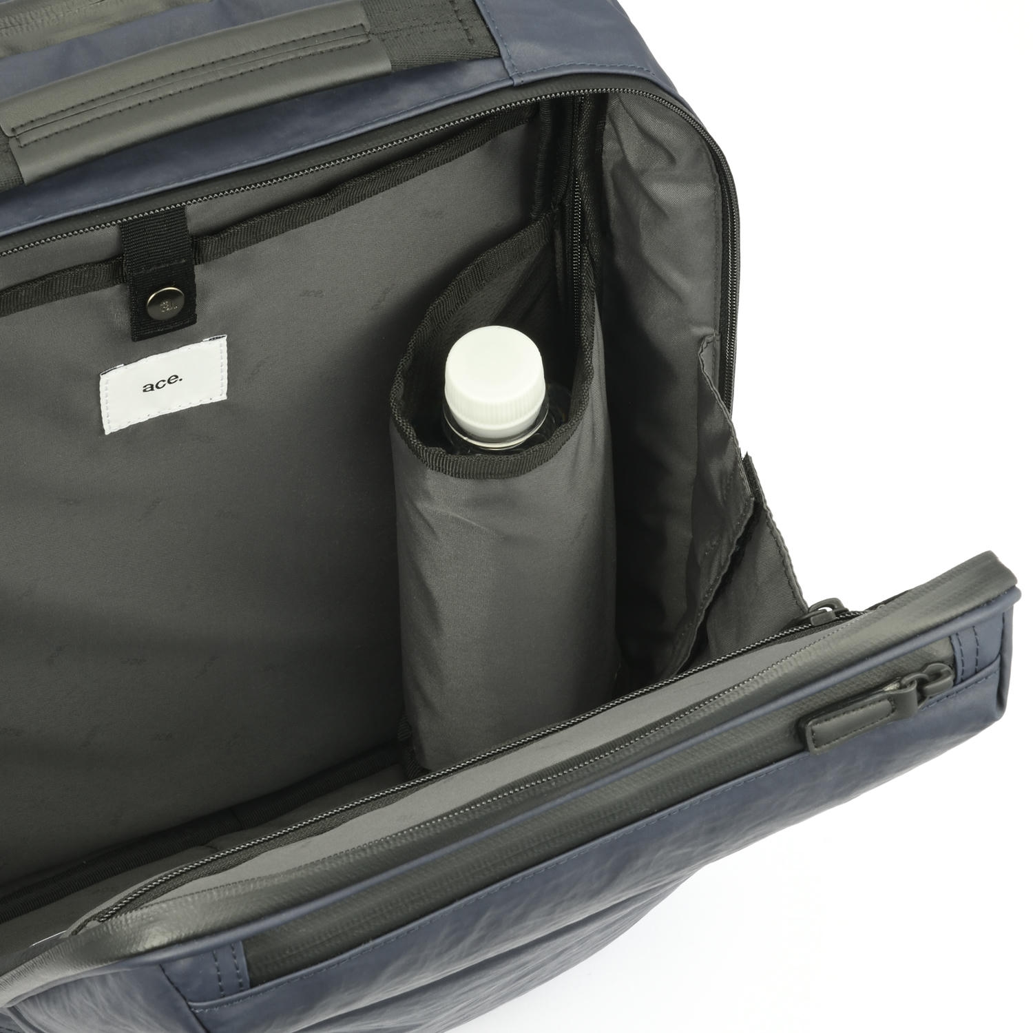 側面ファスナーと本体気室の双方から物の出し入れが可能なポケット。