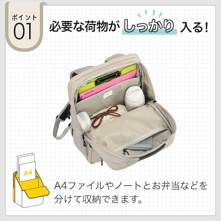 ファイルや教科書を分けて収納可能。A4ファイルサイズ対応。(参考収納寸法:W31.3×H23.1cm)