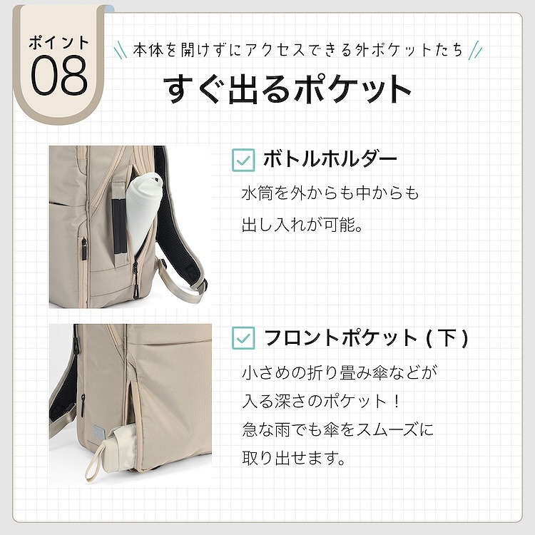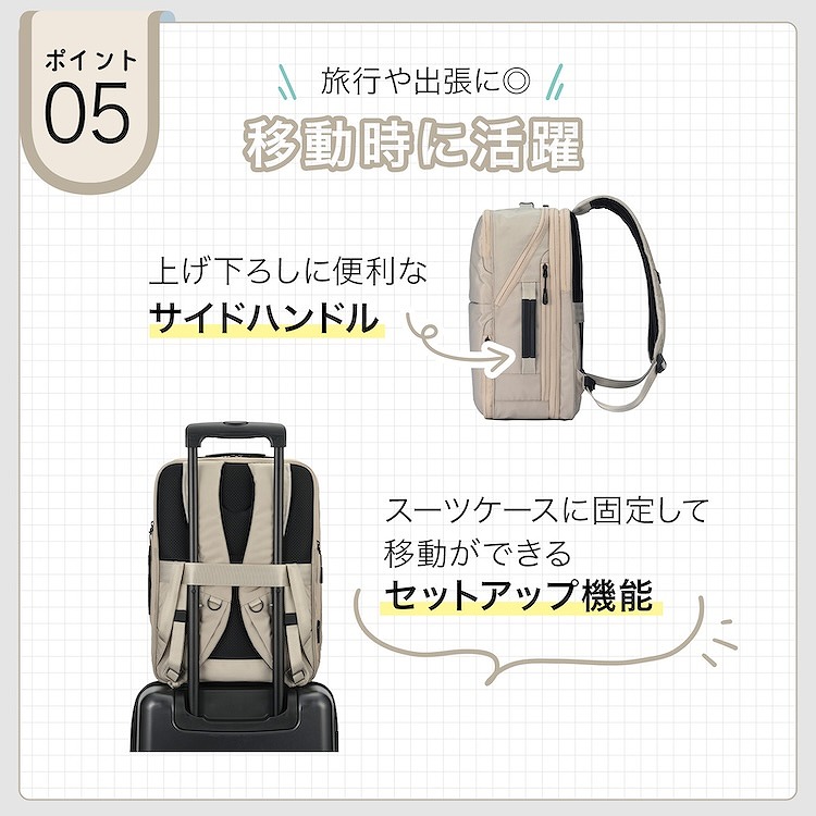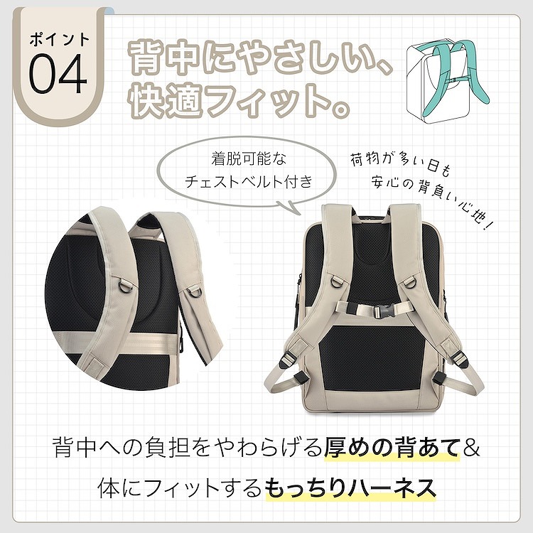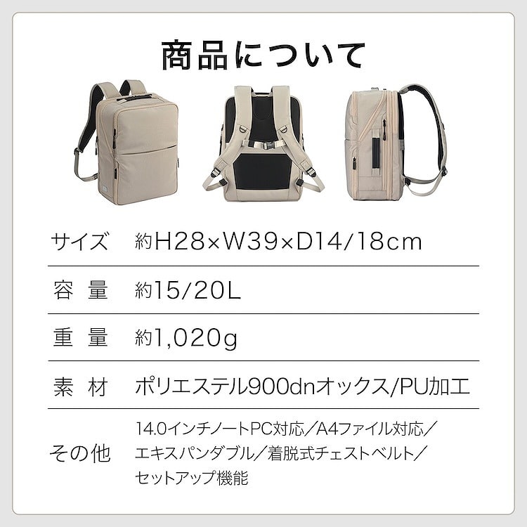 | 機能一覧 | 通学・通勤リュック/A4ファイル/14.0インチPC/エキスパンダブル機能/チェストベルト/リフレクター/エアメッシュ素材/セットアップ機能 |