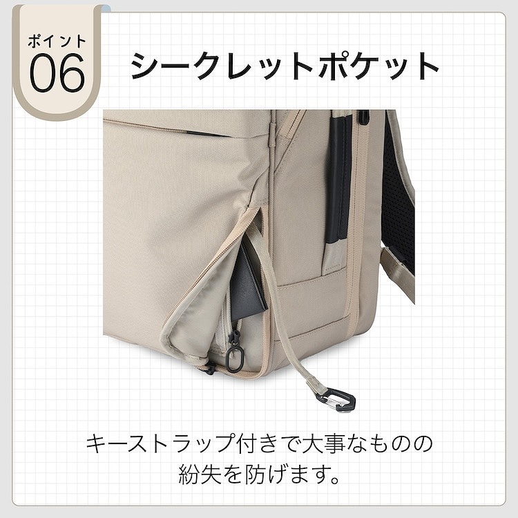 ポケット内にキーリングやファスナー付きのシークレットポケットを搭載。