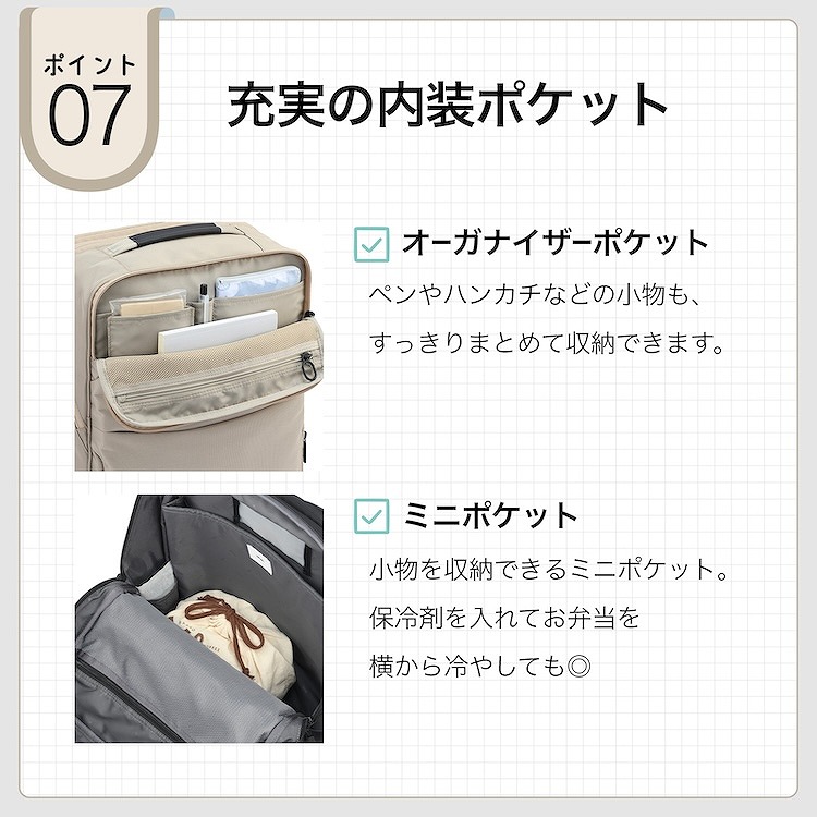 底部分の側面にお弁当を横から冷やせるよう保冷剤ポケットをデザイン。