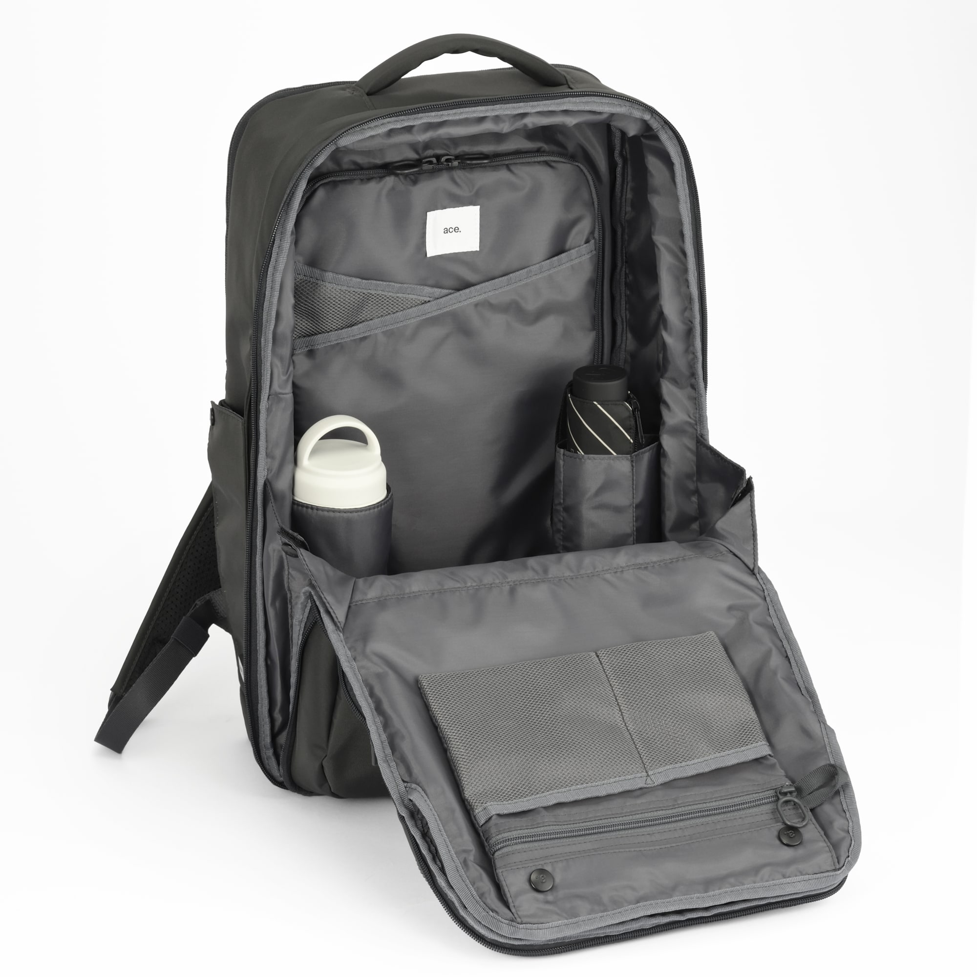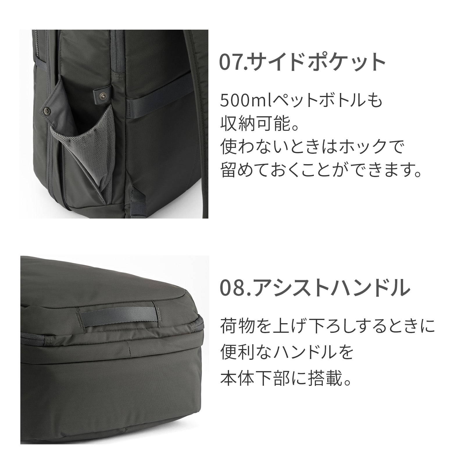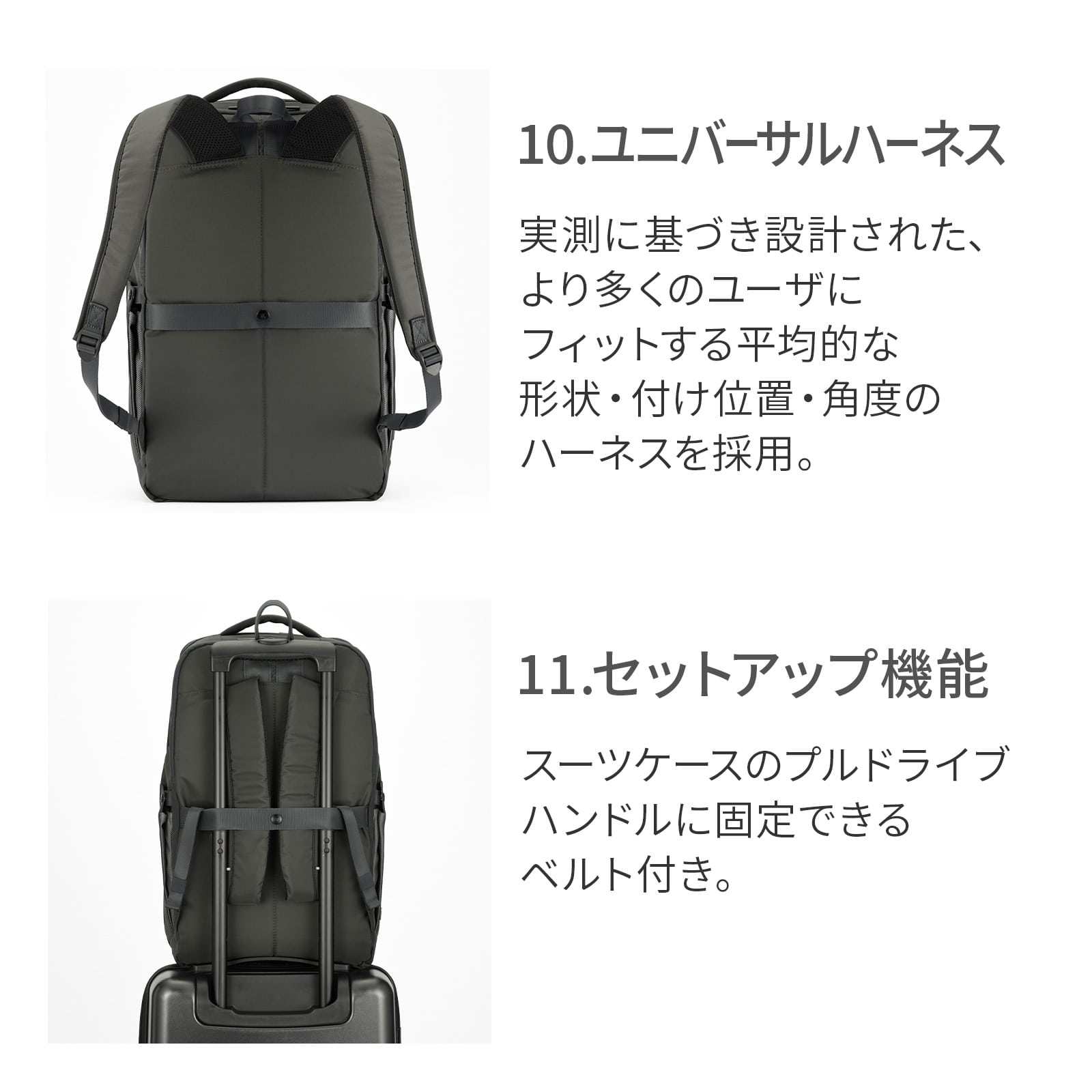 仕分けしやすい内装構造、エキスパンダブル機能、ユニバーサルハーネスなどを備え、荷物が多い日でも安心の大容量ビジネスリュックです。
