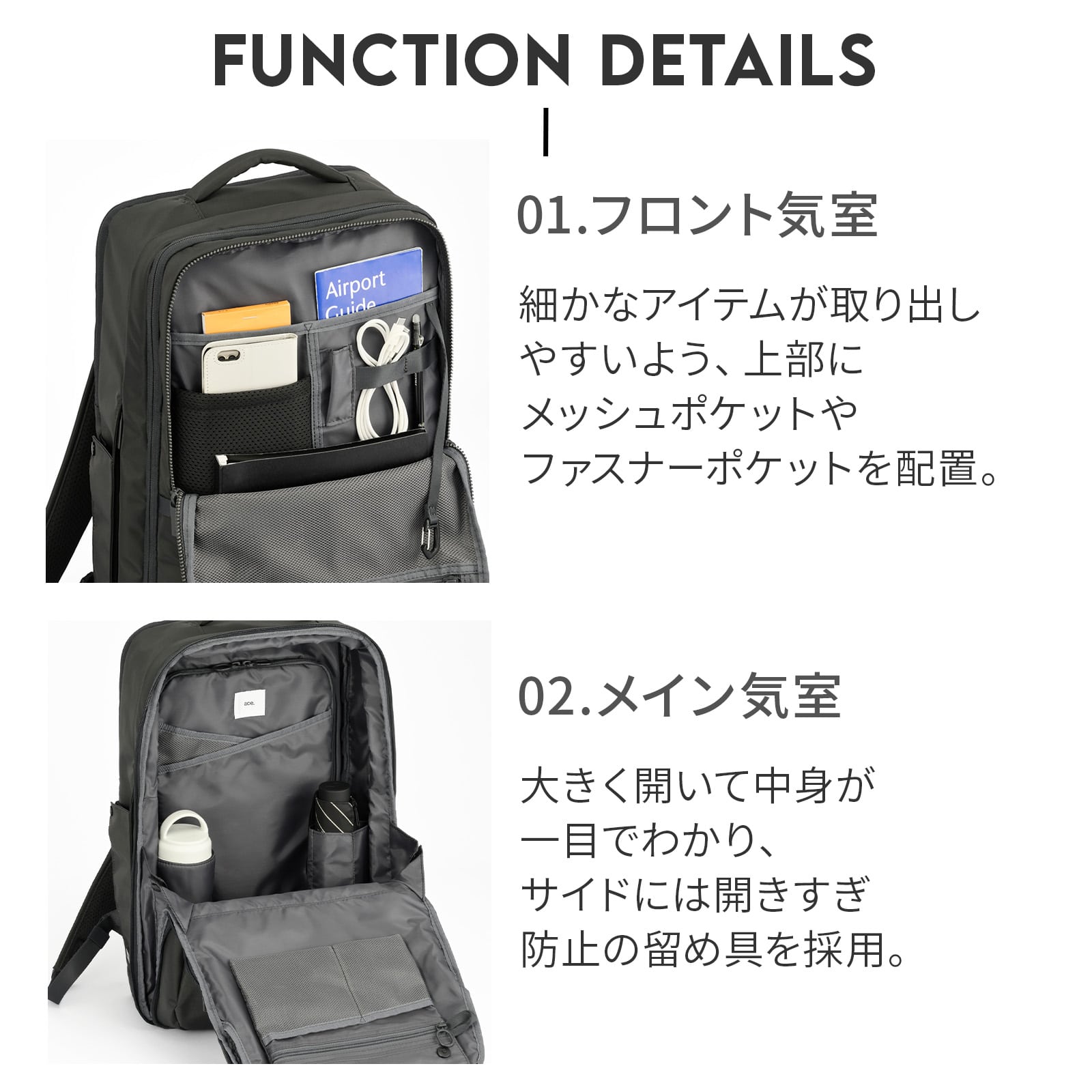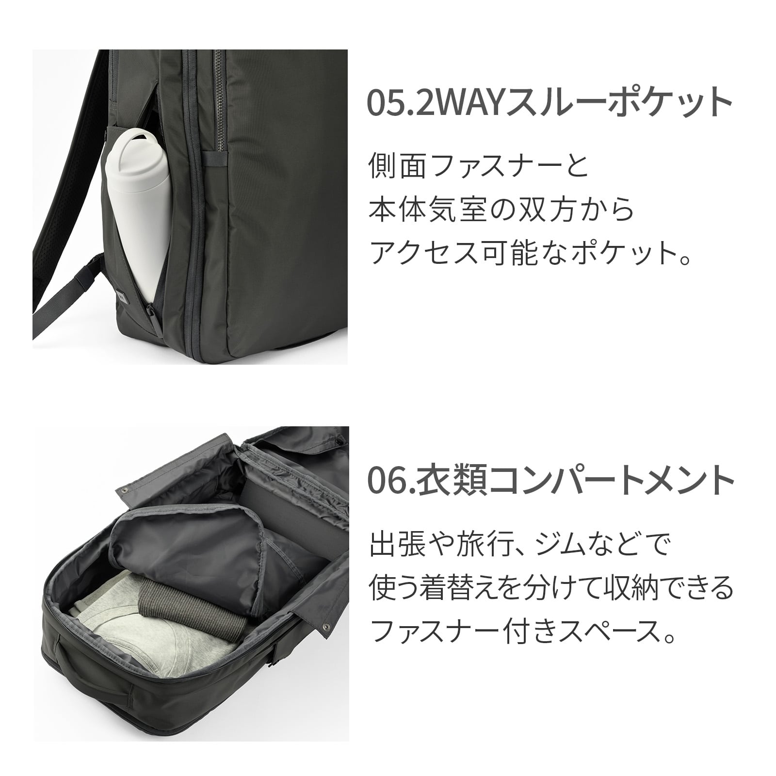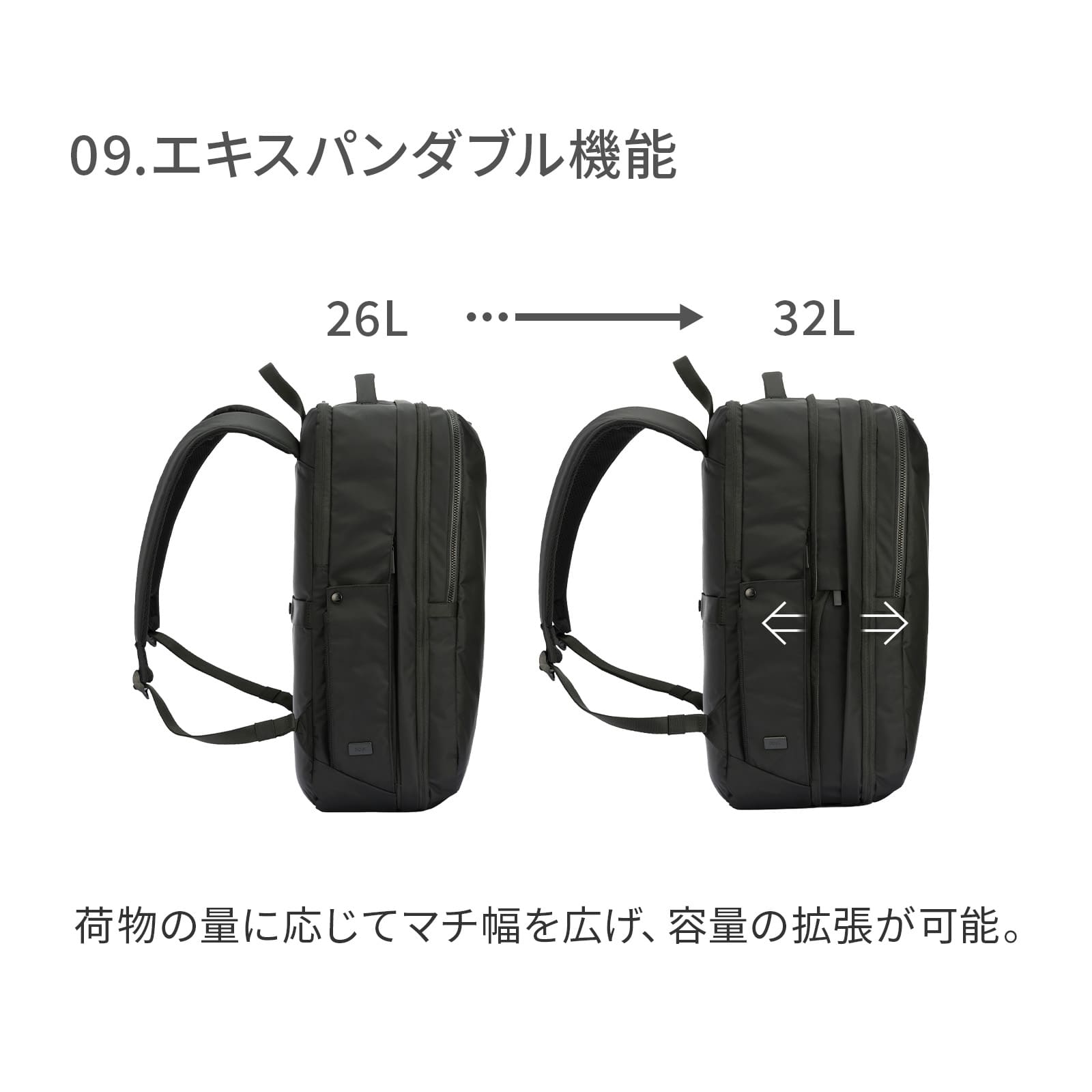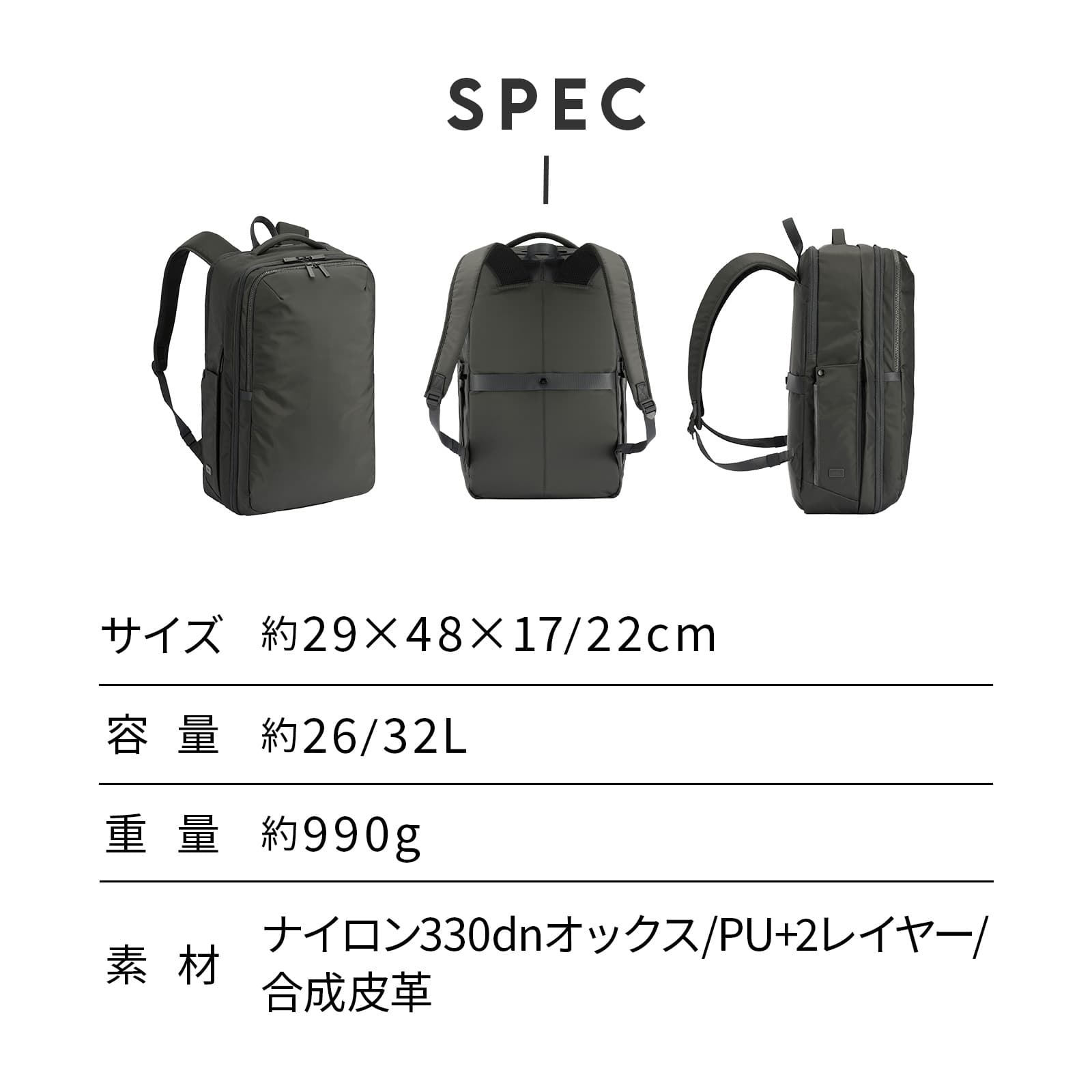 仕分けしやすい内装構造、エキスパンダブル機能、ユニバーサルハーネスなどを備え、荷物が多い日でも安心の大容量ビジネスリュックです。