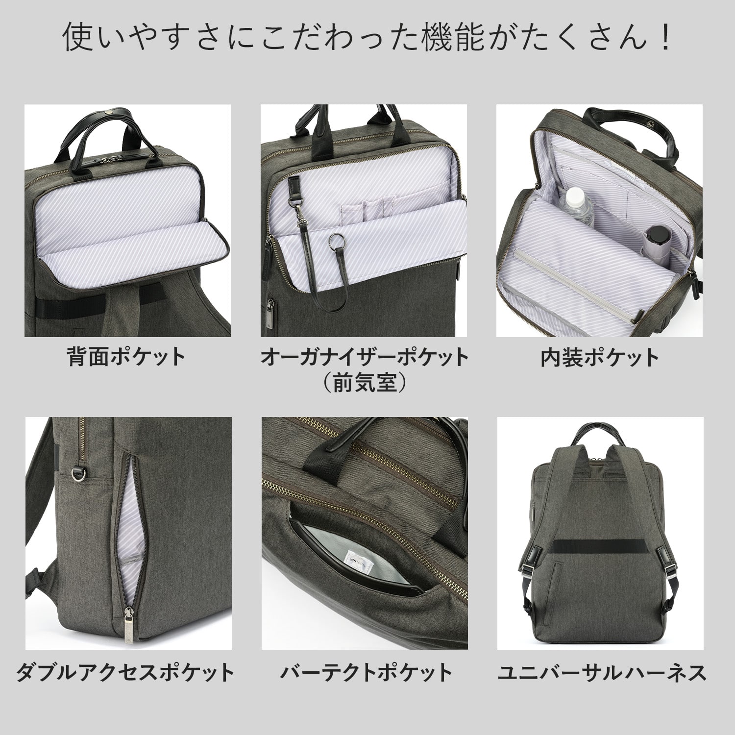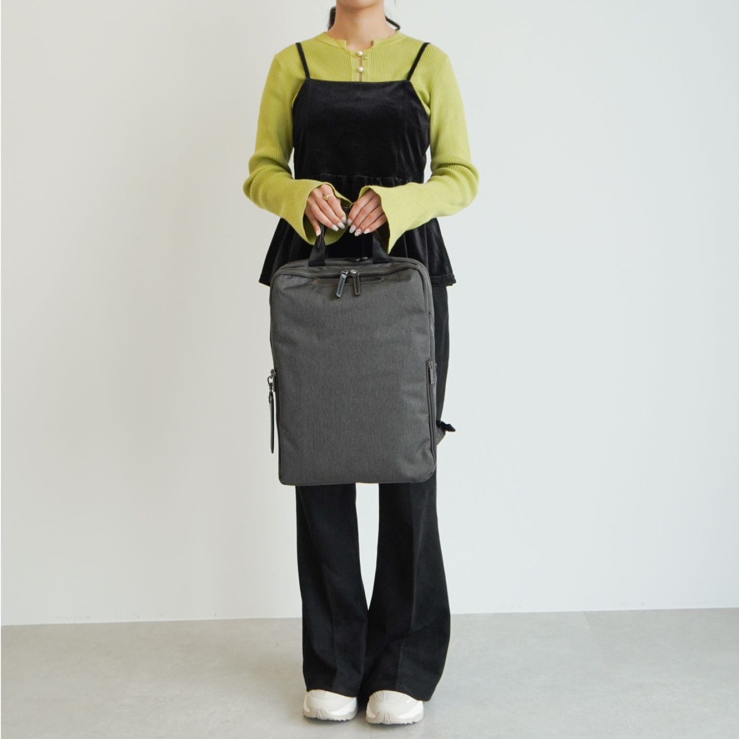通勤に最適なスクエア型のスリムで機能的なA4サイズ対応のビジネスリュック。
