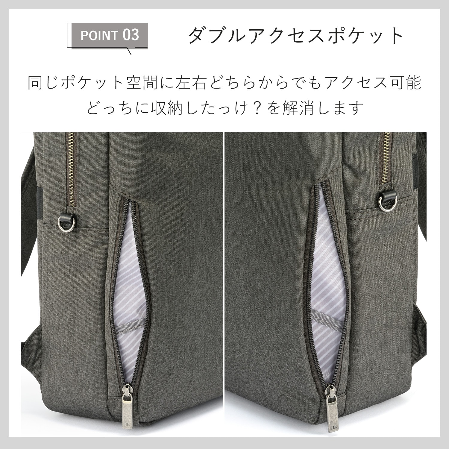 背面にファスナー付きのポケットを配置。貴重品の管理などにも役立ちます。
