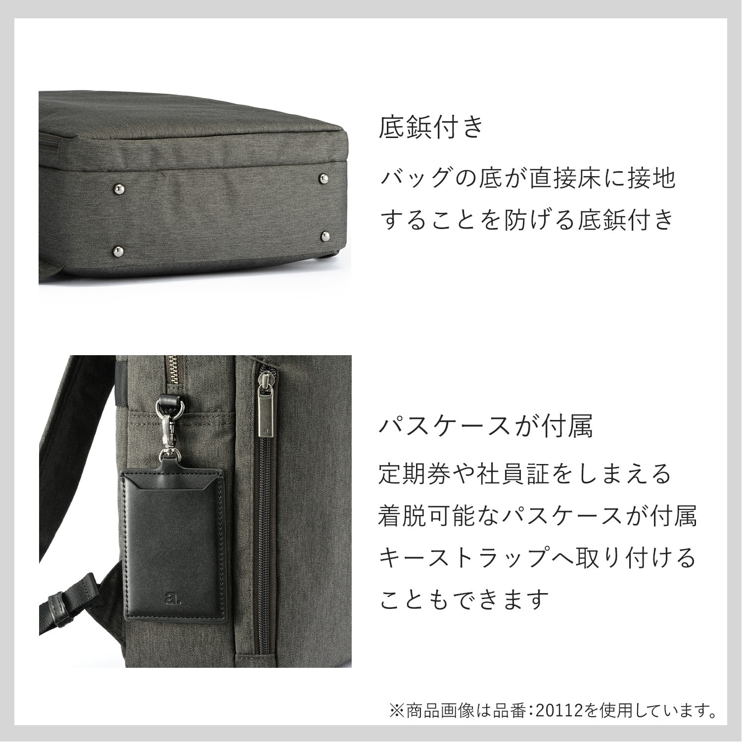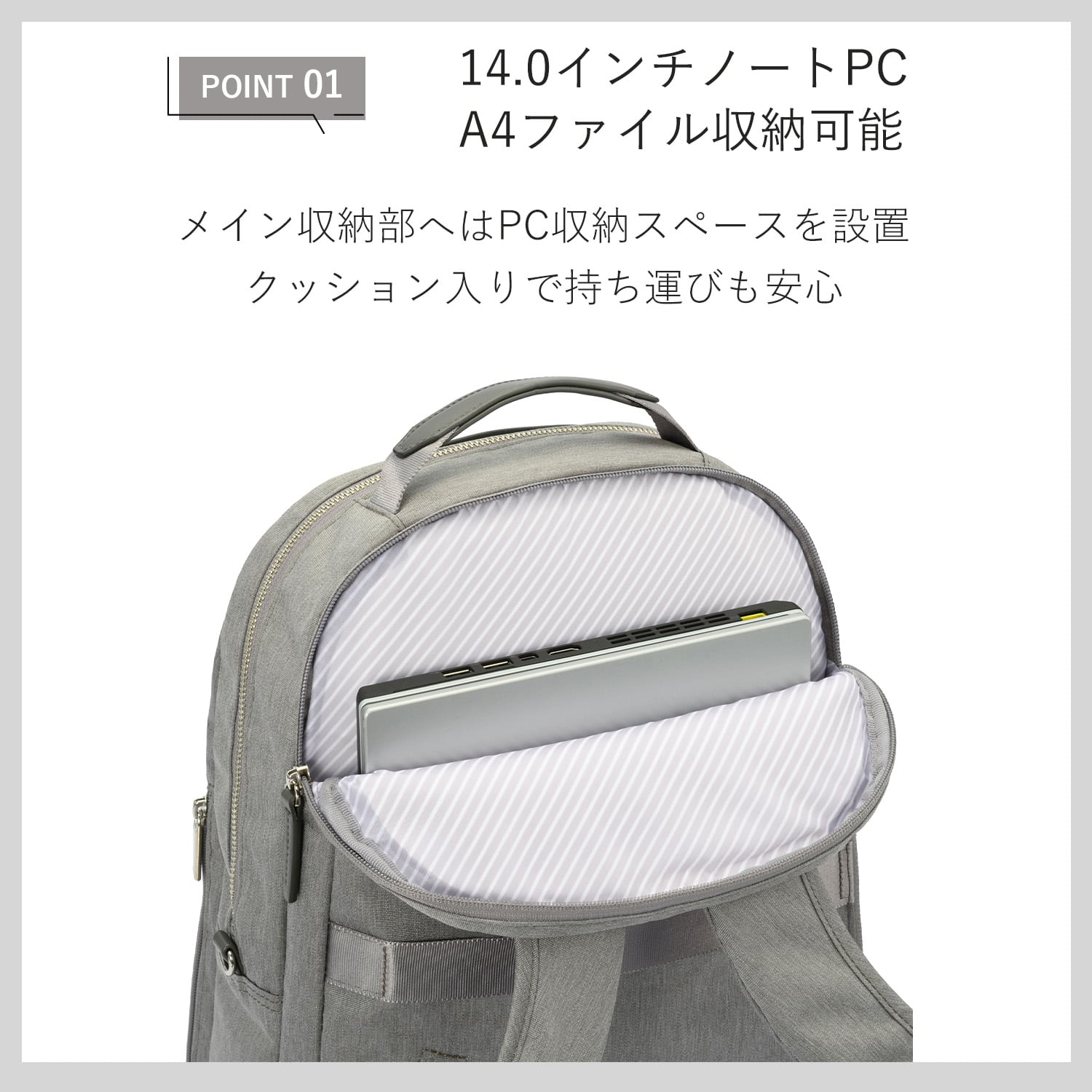 薄暗い場所でも荷物を見つけやすいよう、明るいグレーのストライプ生地をメイン気室、フロントポケットに採用。