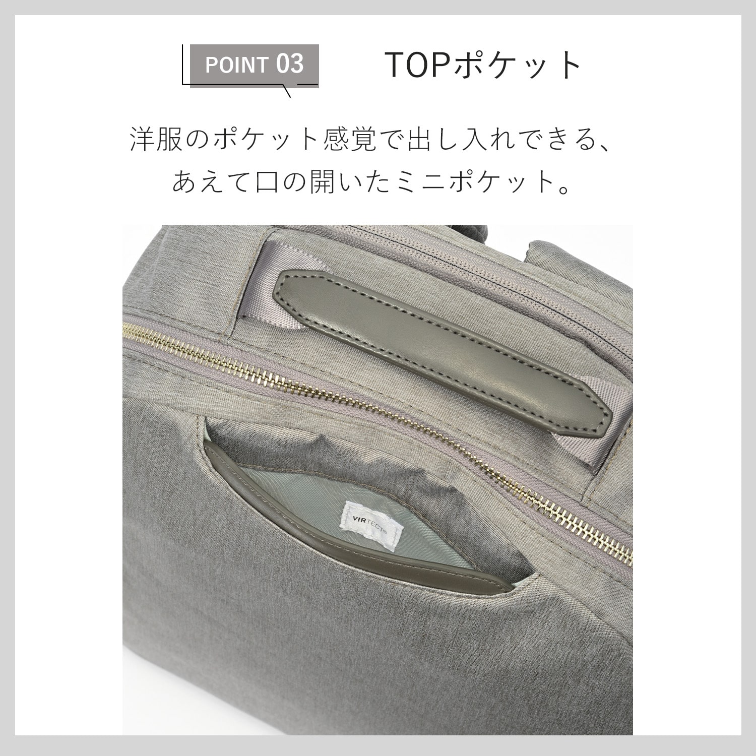 フロント上部は抗ウイルス・抗菌加工生地を使用したポケットを設置。(※)