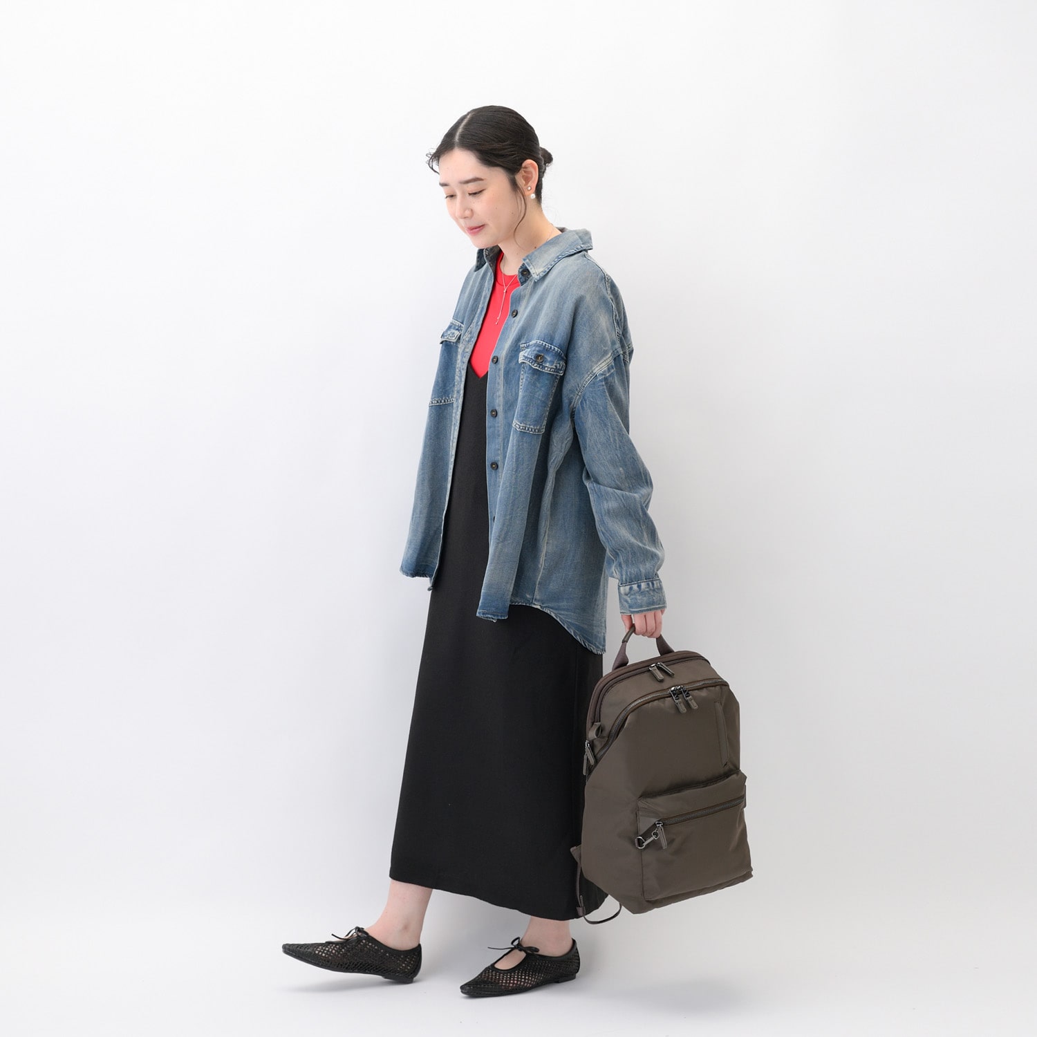 お仕事リュックとしてのちゃんと見えを保ちつつ、カジュアルな服装にも合わせやすい、かっちりしすぎないシルエットにもこだわりました。