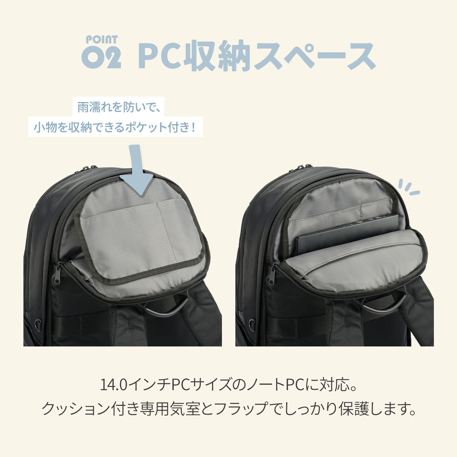 14.0インチPC対応の独立スペース。端子部分をカバーできるフラップ&小物ポケット付き。
