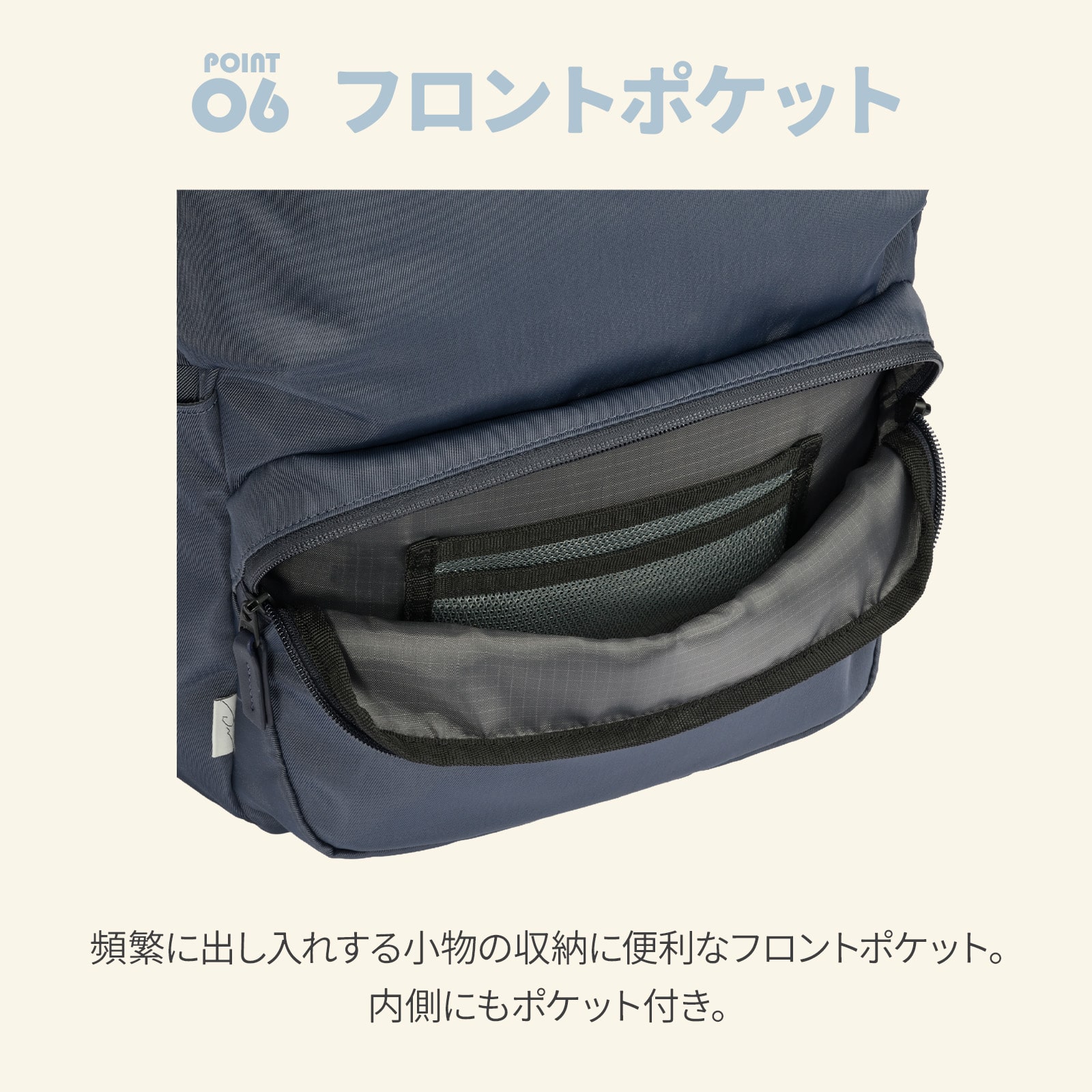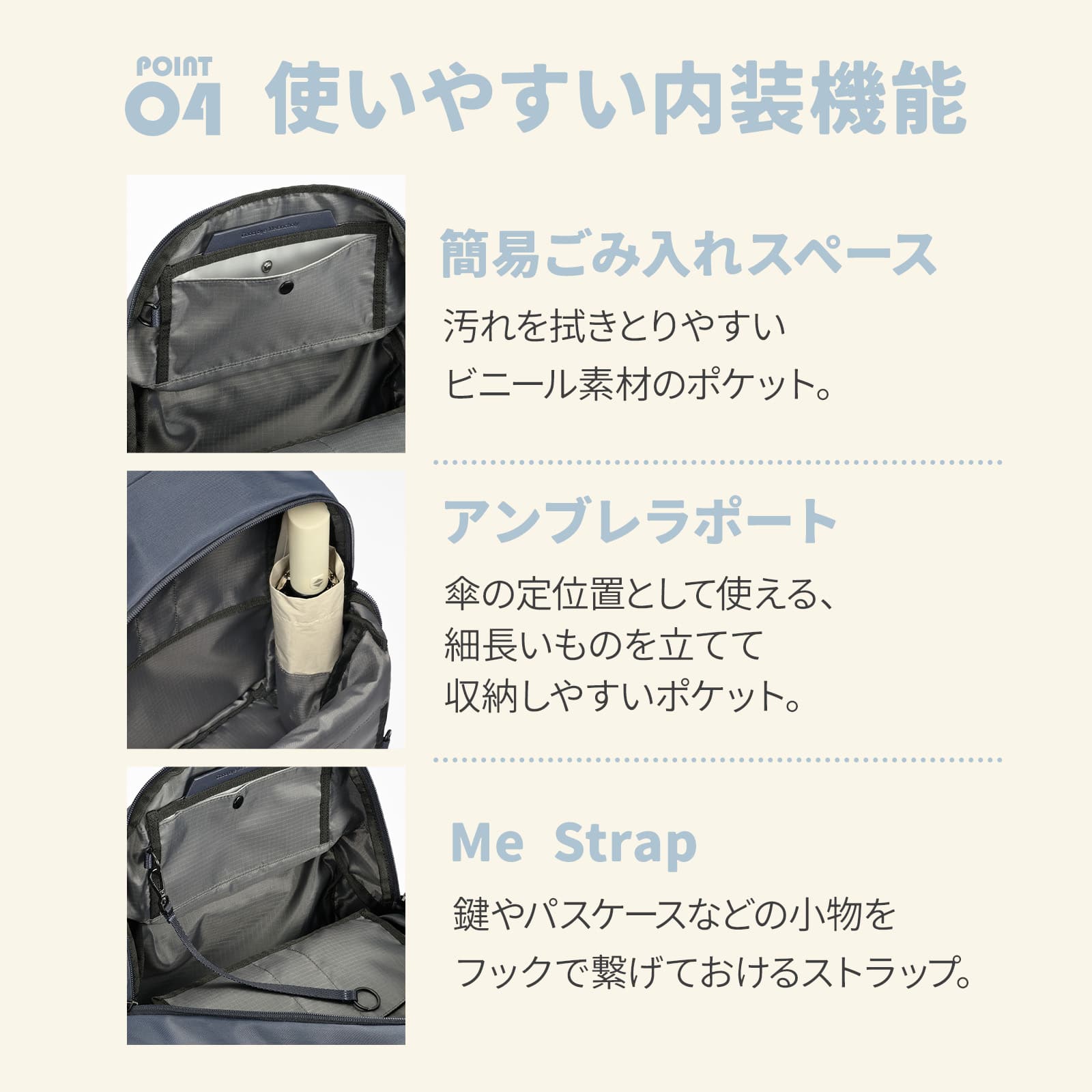 | 機能一覧 | 2気室/B4ファイル収納/PC収納(14.0inch)/ティッシュポケット/メッシュポケット/他ポケット多数/Napping pl.(スマートフォンポケット)/Me Strap(キーストラップ)/セットアップベルト/エキスパンド機能/ポーチ付属 |