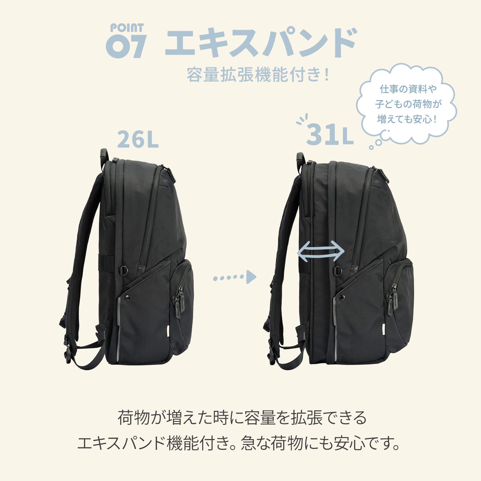 26L→31Lに拡張可能。荷物が多いときも安心です。