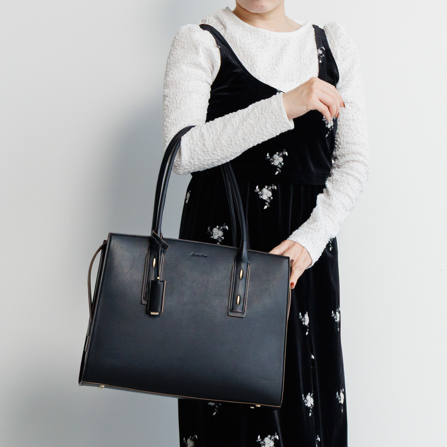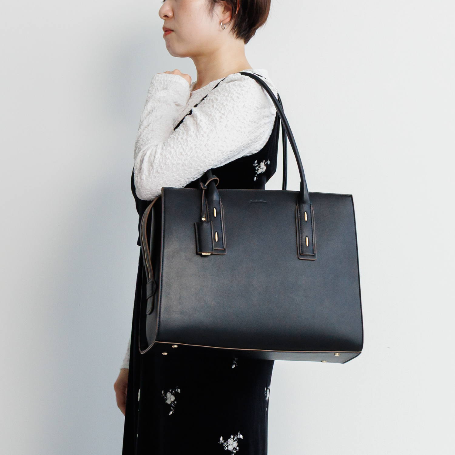 ハンドルの付け根にバーモチーフをあしらい、スタイリッシュなチャームが付属したシンプルなデザイン。