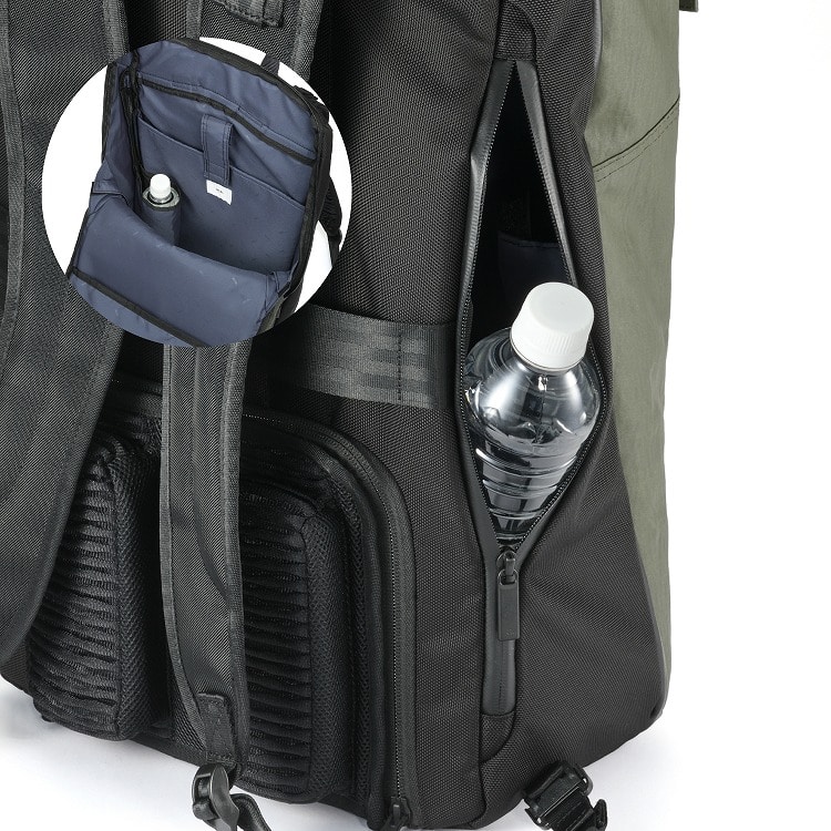 側面ファスナーと本体気室の双方から物の出し入れが可能なポケット。内側に吸水速乾機能のある素材を使用。