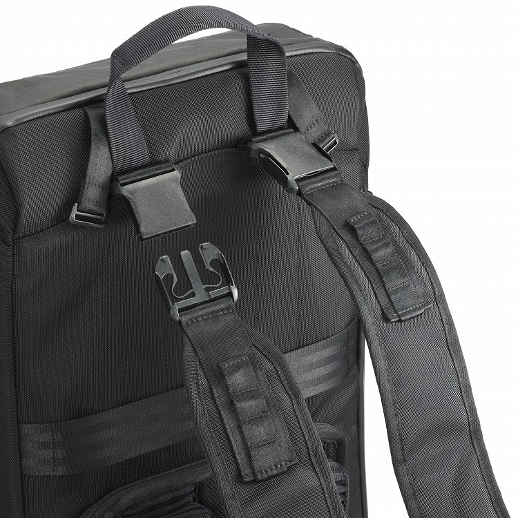 リュック上部の前倒れを防ぐ為に、ハーネス上部に位置調整可能なロードリフターストラップを搭載。