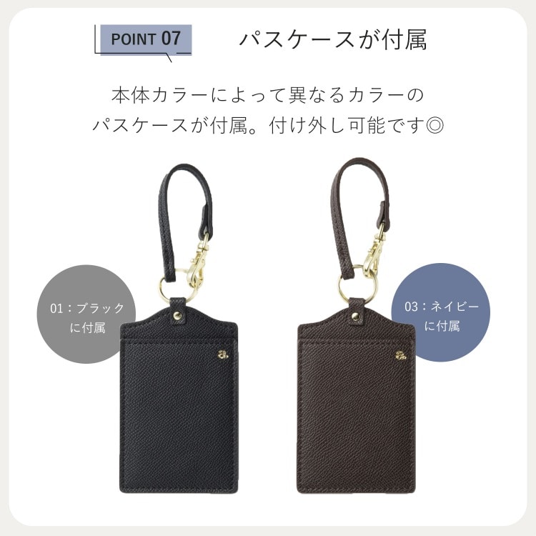 バッグのデザインに合う取り外し可能なパスケース付き。