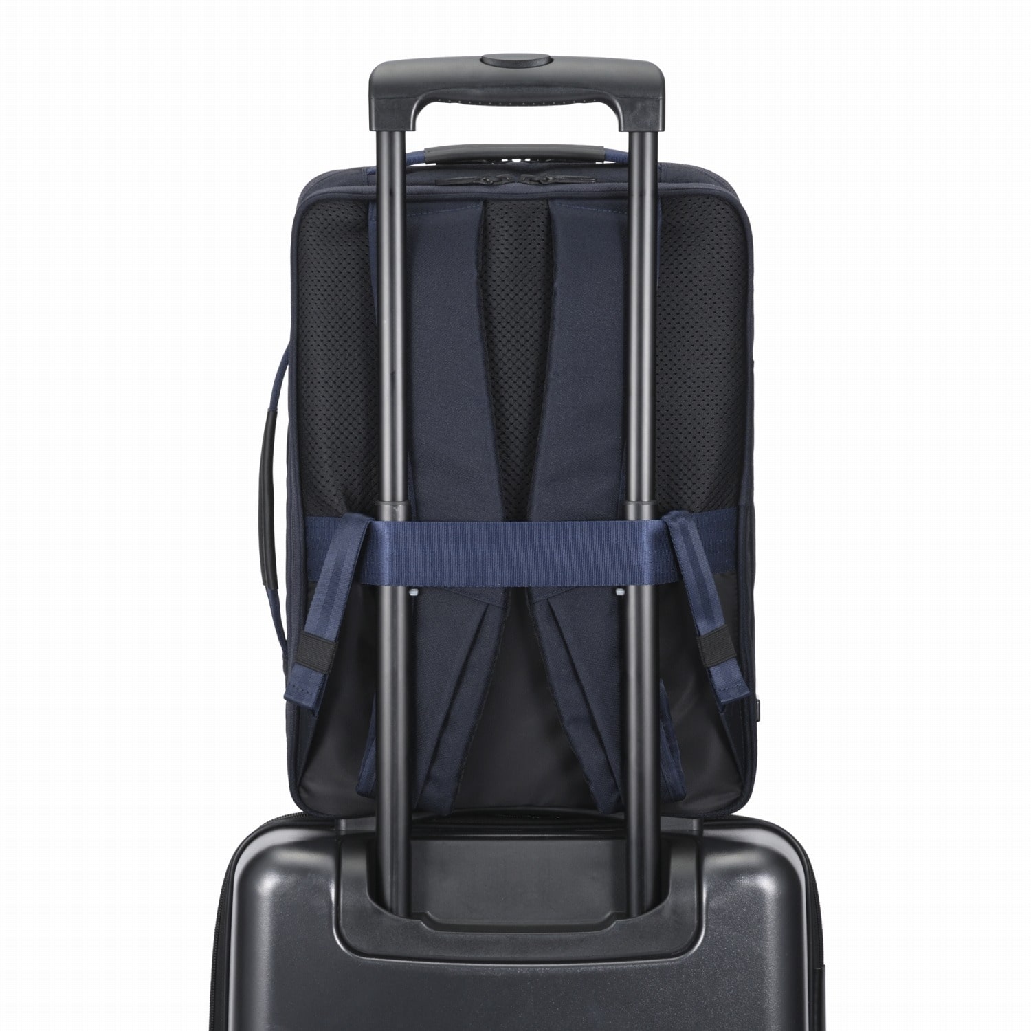 リュック背面へはスーツケースのハンドルに固定可能なセットアップベルトを設置。
