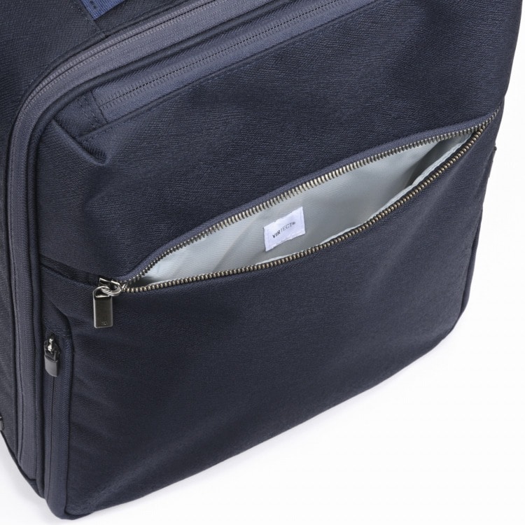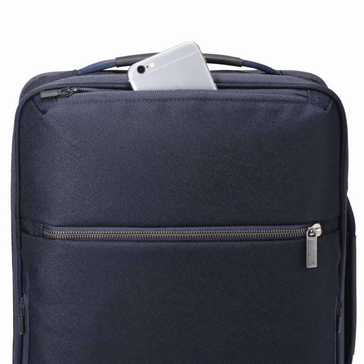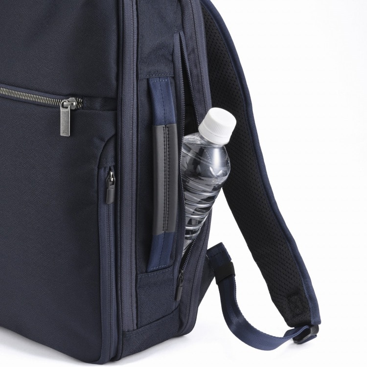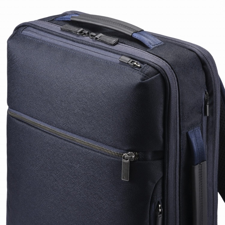 上品な印象を与える本体素材と、フロントポケットの金属ファスナーでファッション性を高めたデザインに仕上げています。