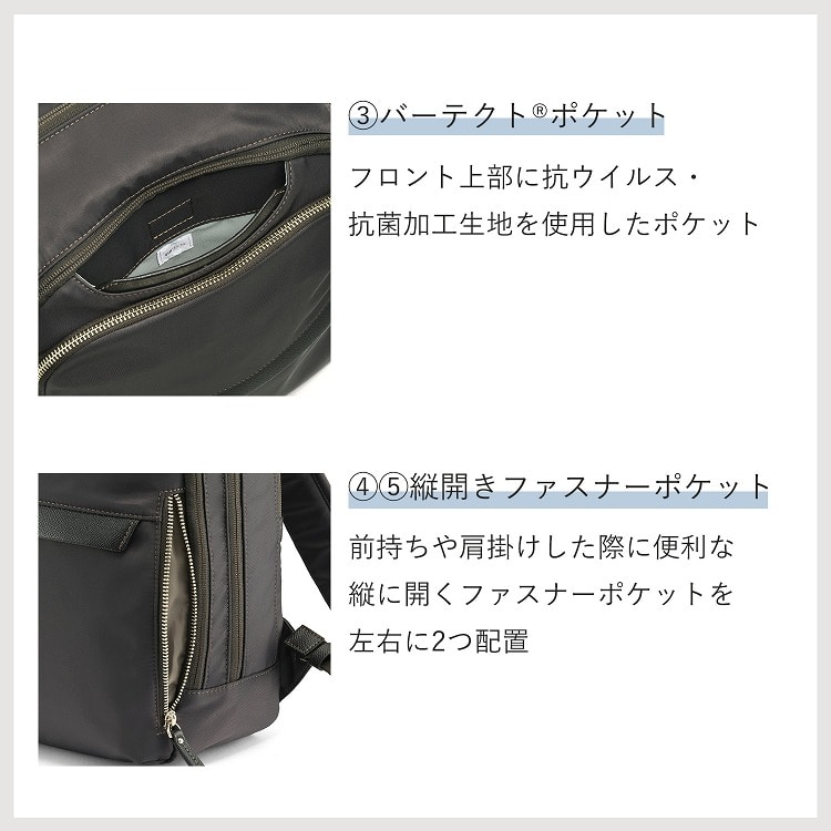 フロント上部に抗ウイルス・抗菌加工生地を使用したポケットを設置。(※)