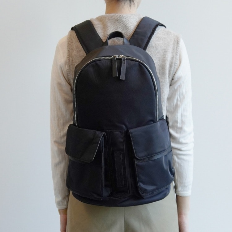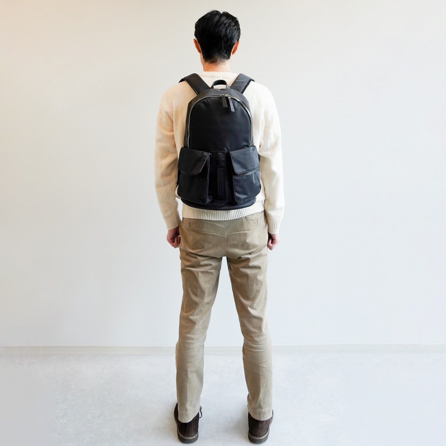 フロントのフラップポケットや直線的な切り返しで随所にクラシカルな要素は残しつつ、都会的でモードなデザインに仕上げています。