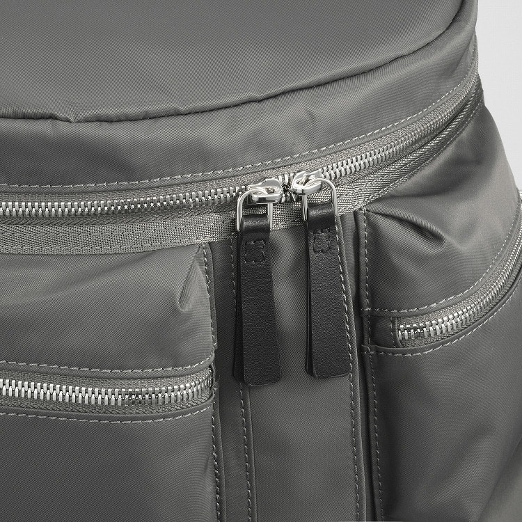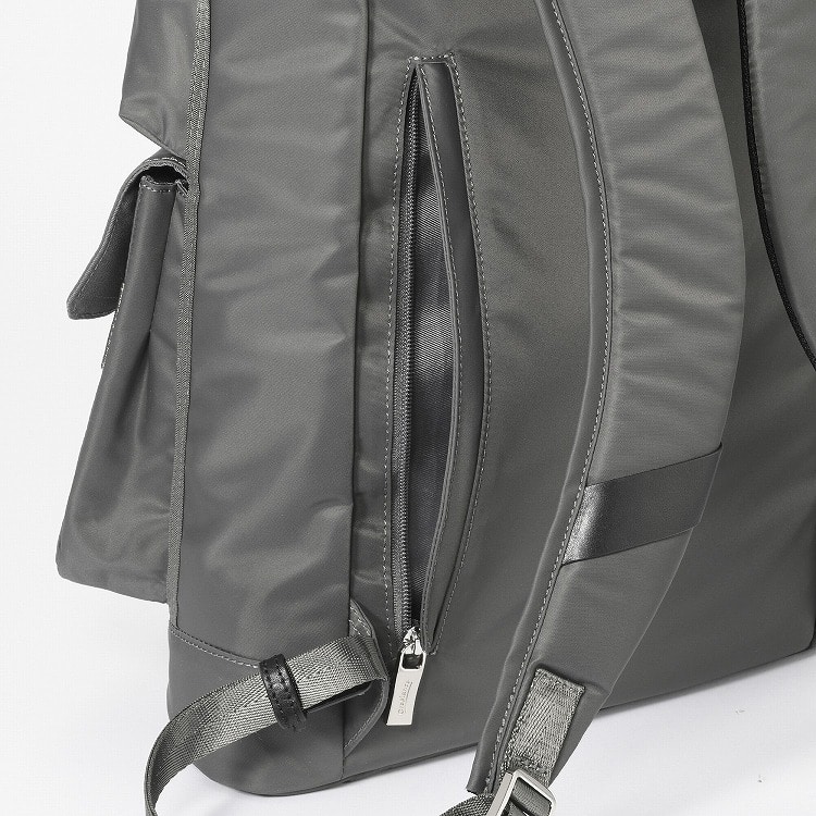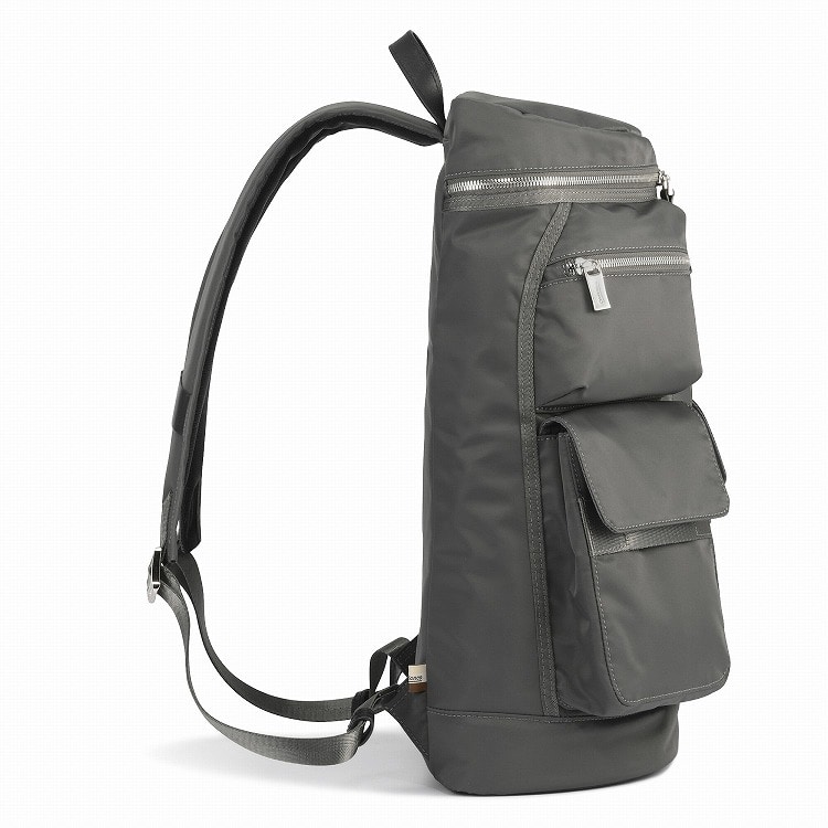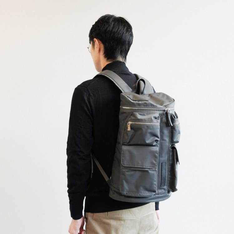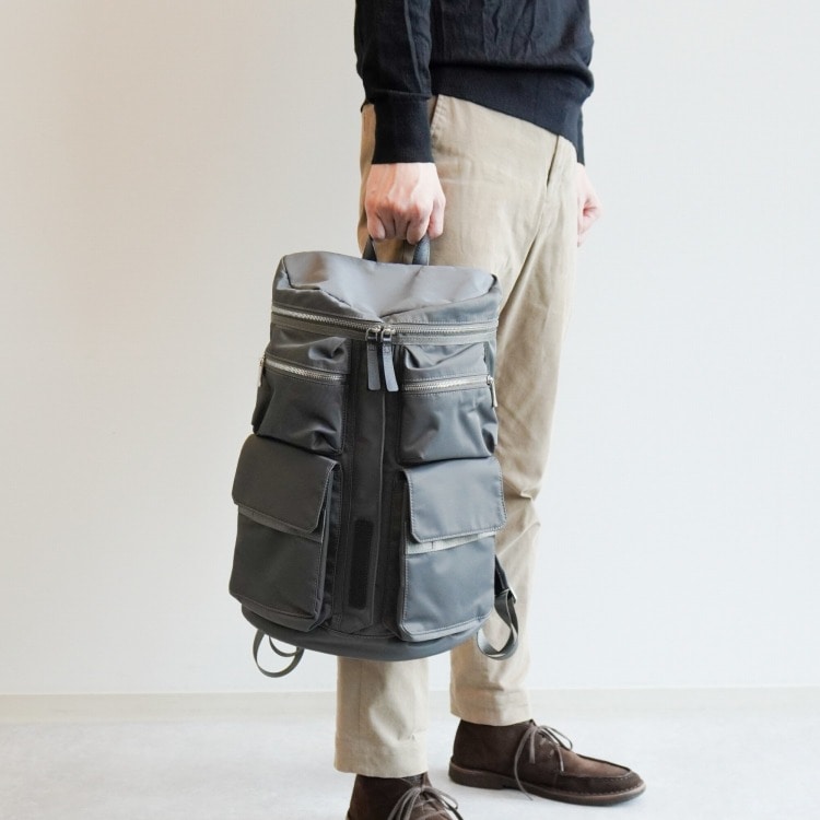 繊維生産過程に発生する廃材を再生して作られたリサイクルナイロンを使用。高密に織り上げた、綺麗目なツイル素材