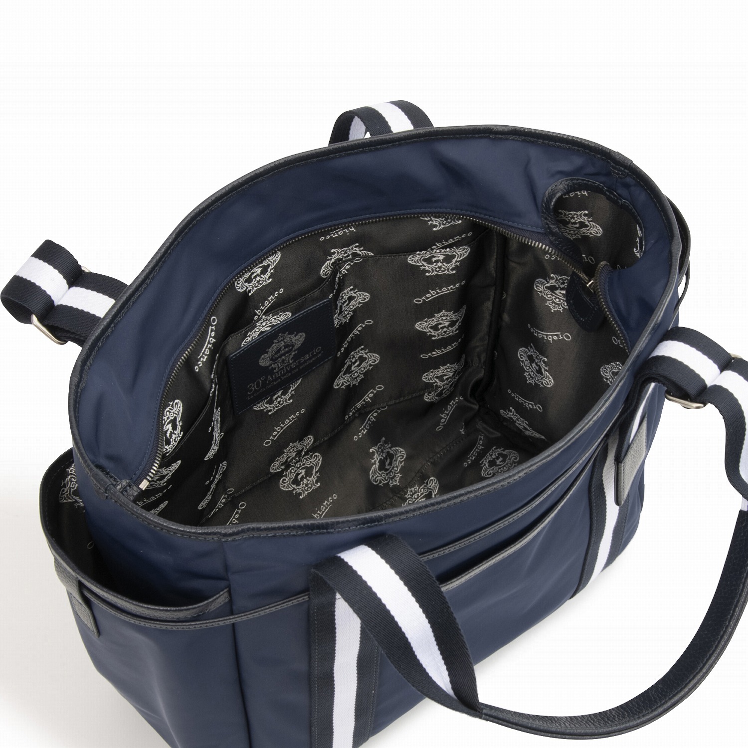 オロビアンコ30周年を記念した、ベーシックシリーズ。内装へはレザーに箔押しで表現した30周年限定グラフィックをデザイン。