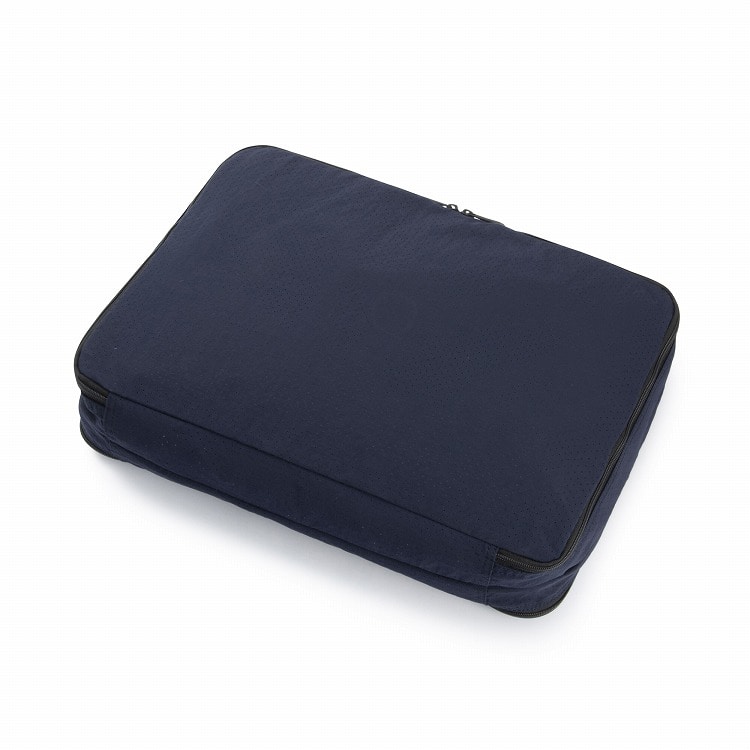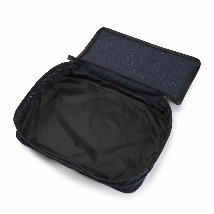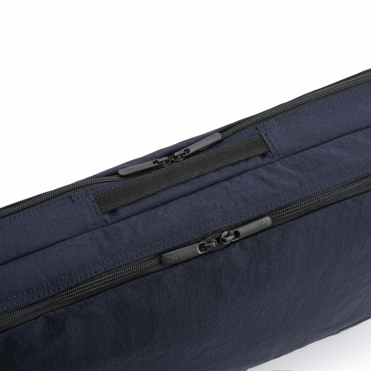 柔らかいナイロン素材にパンチング加工を施すことで、ファスナーを閉めても空気が抜けやすく、デッドスペースを抑えたスマートな収納を実現します。