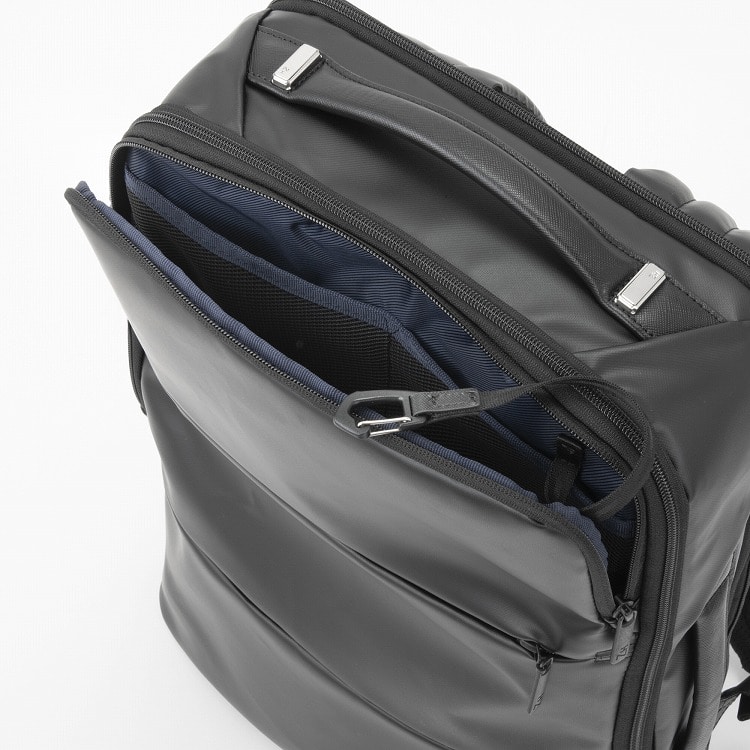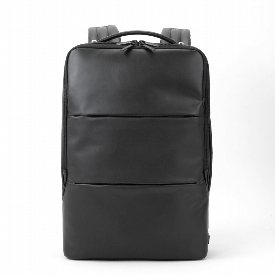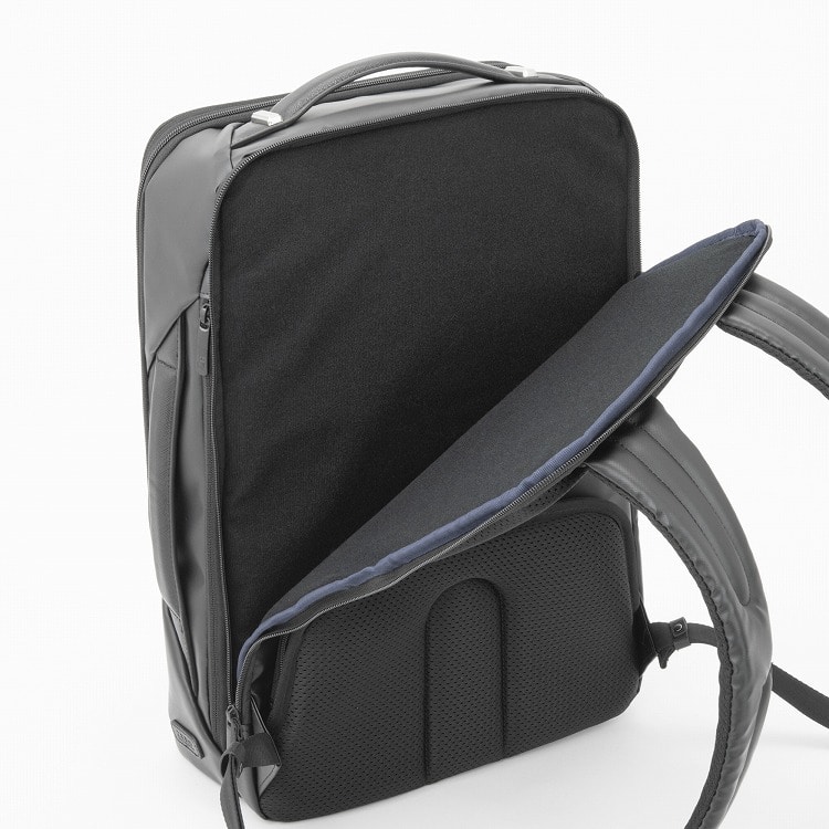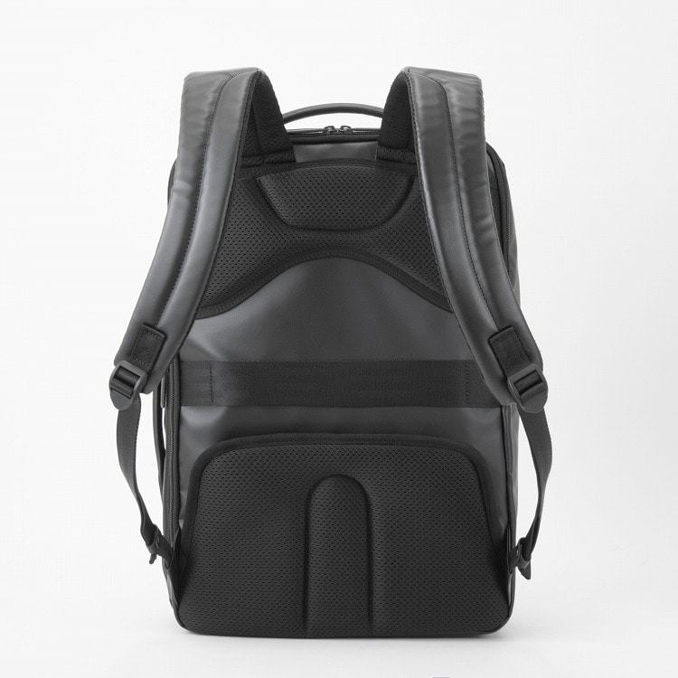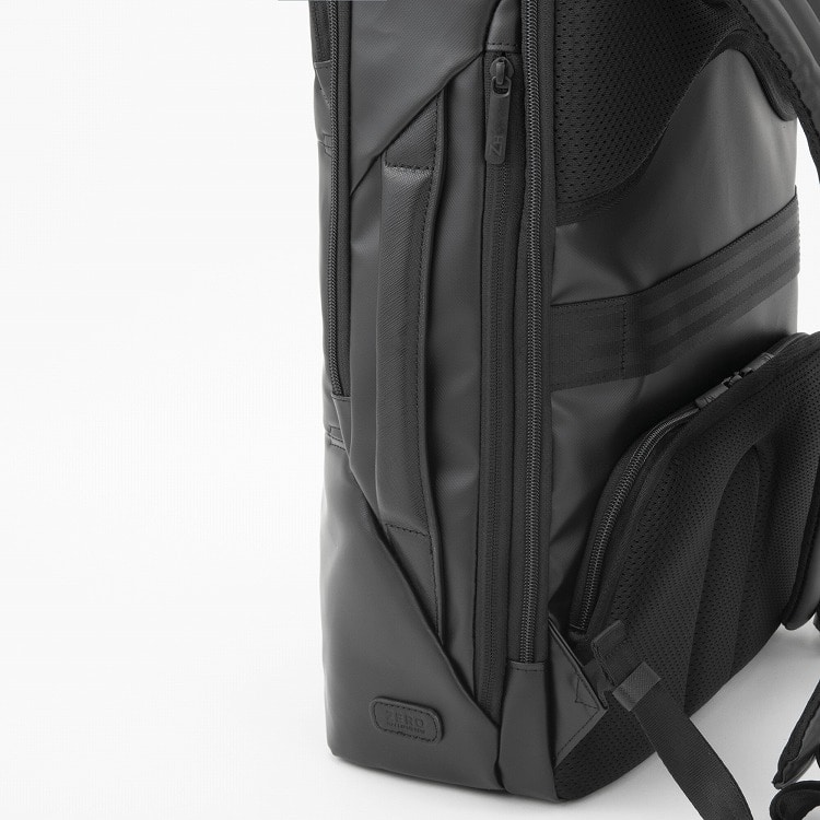 シンプルでスタイリッシュなデザインに、快適な使い心地を追求した機能を搭載。耐久性と撥水性に優れた〈ポリエステル600dnオックス(表PVC加工)〉を主素材に、上質な〈牛革〉を副素材に取り入れることで、上品さと実用性を兼備しました。さまざまなシーンで活躍するこのリュックは、ビジネスパーソンの理想のパートナーです。