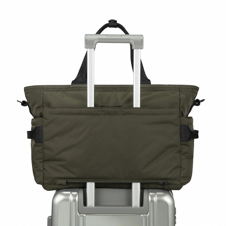 両側面にはハンドルが取り付けられているため、車のトランクやロッカー、電車の網棚への収納も容易で、利便性が向上。さらに、スーツケースへのセットアップ機能を搭載しており、旅行時のサブバッグとしても活躍します。同じ生地を使用したベルトは、統一感を高めつつ、取り外し可能な仕様で使用スタイルに合わせて使い分けることができます。