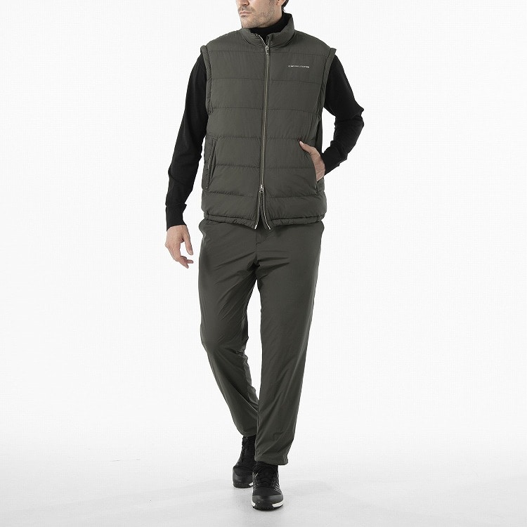 冷え込む朝はジャケットとして、気温が上がる日中はベストとして着用でき、シーンや気候に合わせた温度調整が可能です。ゴルフシーンはもちろん、日常のスタイリングにも取り入れやすいシンプルなデザインでありながら、メタリックなファスナーとロゴがさりげなく存在感を放ちます。