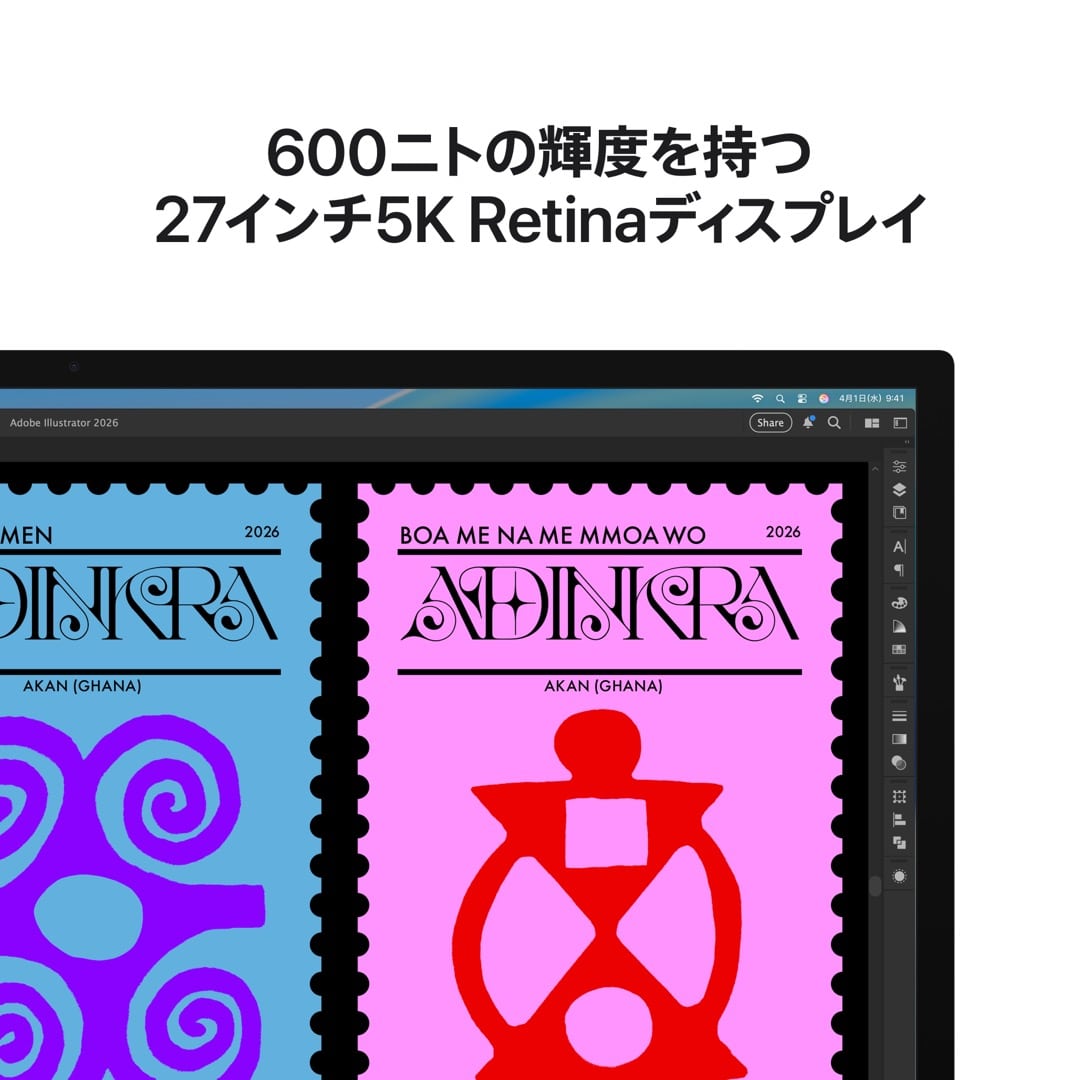 | 同梱物 | Studio Display(標準ガラス、傾きを調整できるスタンド搭載)、Thunderbolt 5(USB_C)Proケーブル(1m) |