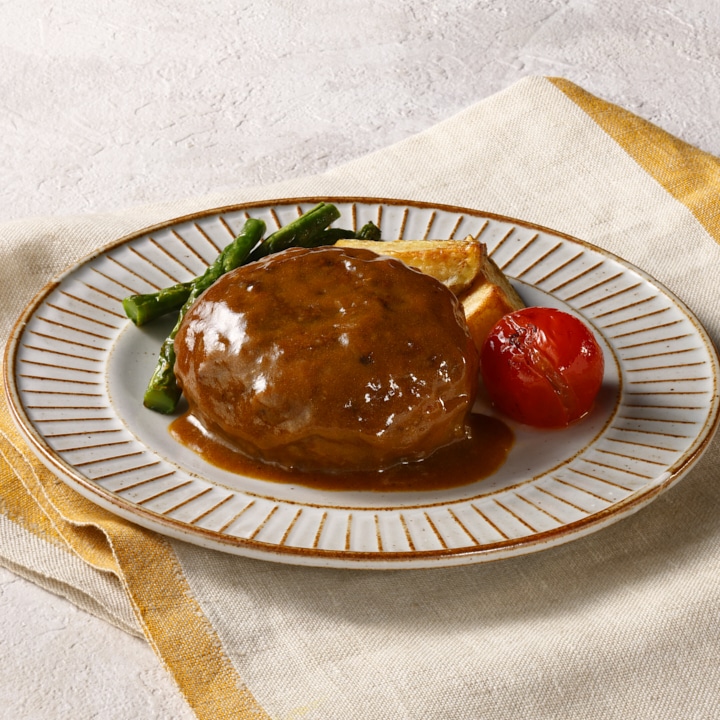 原材料名:ハンバーグ(国内製造(豚肉(国産)、牛肉(国産)、玉ねぎ、パン粉、その他))、和風ソース(醤油、玉ねぎ、砂糖、酒、その他) / PH調整剤