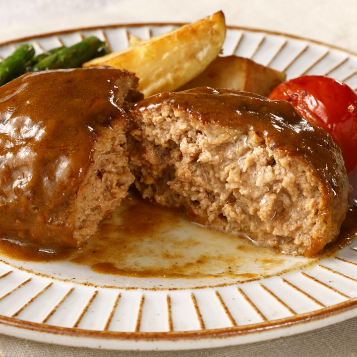 原材料名:ハンバーグ(国内製造(豚肉(国産)、牛肉(国産)、玉ねぎ、パン粉、その他))、デミグラスソース(ビーフブイヨン、トマトケチャップ、赤ワイン、ルウ、その他) / PH調整剤