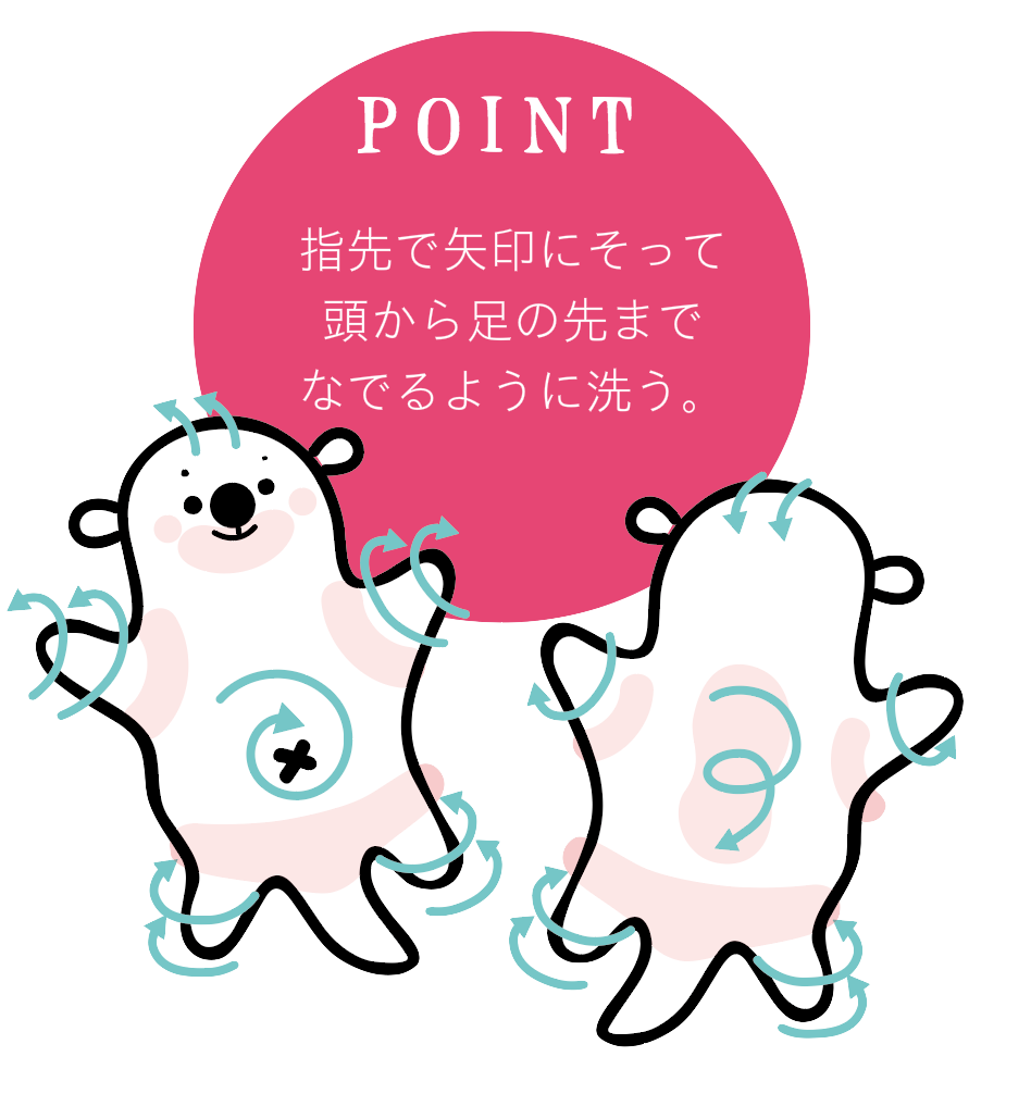 そのままやさしく指先をつかって、濡 れたお子様のお顔や全身に馴染ませた後、ぬるま湯でサッと洗い流してください。