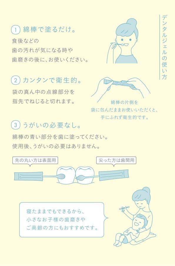 綿棒を使用して簡単に塗布できるため、歯磨きが難しいお子様や高齢者にとっても利用しやすい仕様となっています。