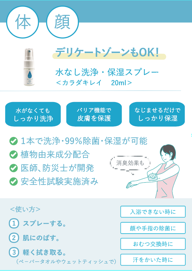 災害時に清潔な生活環境を維持することは、安全で快適な避難生活の鍵。 備蓄は最低でも3日分は必要と言われています。災害時に必要な3日間使える、水のいらない身体と口の「安心防災衛生セット」には、医師、防災士が開発した水不要の洗浄保湿スプレー『カラダキレイ』と、綿棒で塗るだけの口腔ケア製品『レクチノーラル』が含まれています。