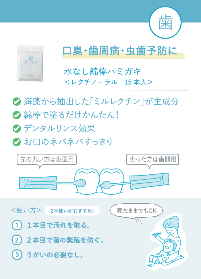 使用利点 : レクチノーラルは、歯が生え始める段階から使用できる安全な製品です。