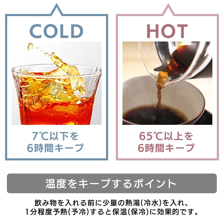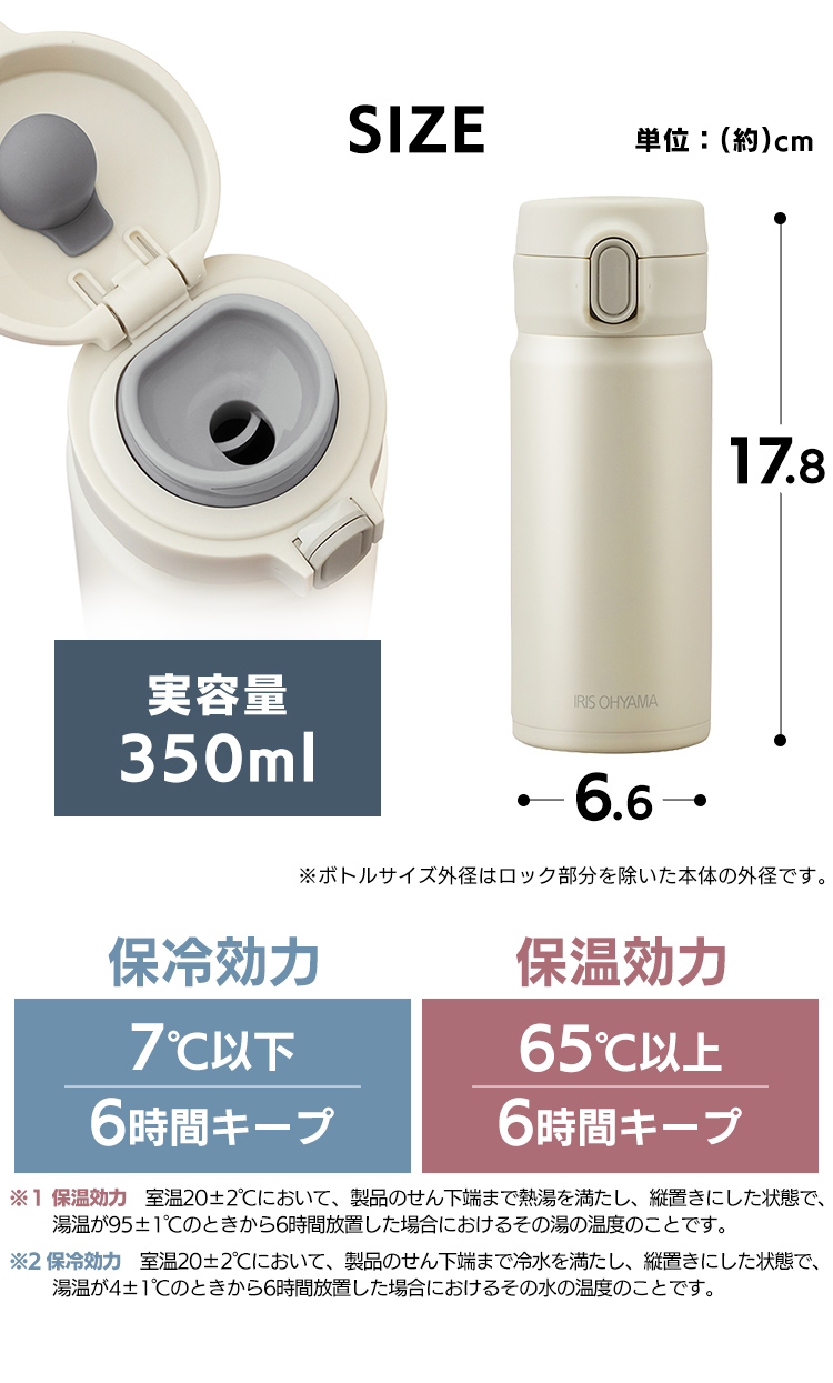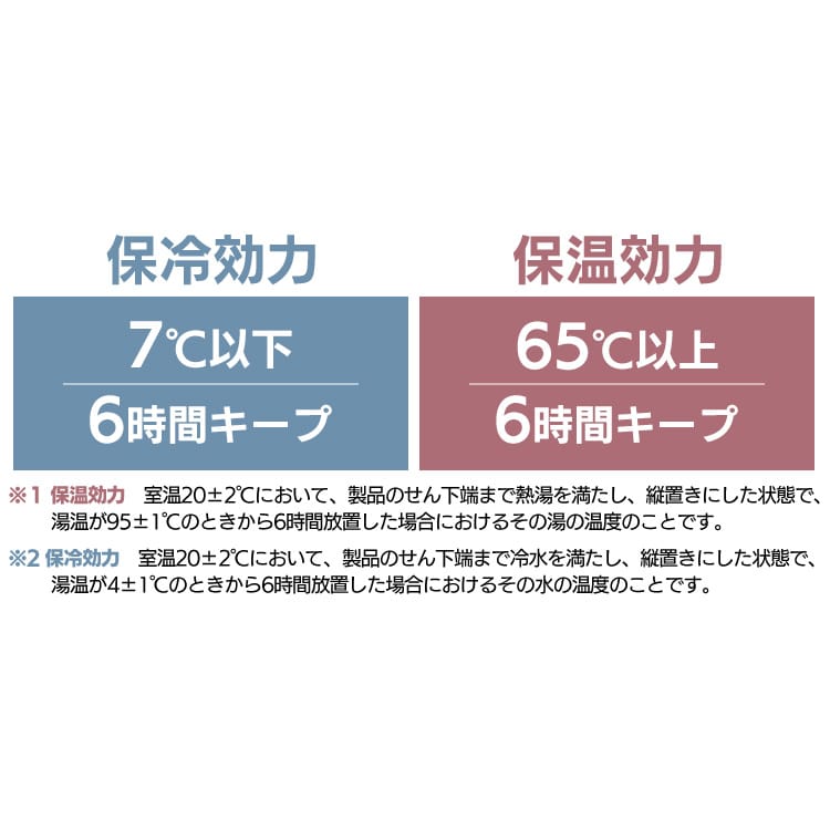 ※2 保冷効力 室温20±2℃において、製品のせん下端まで冷水を満たし、縦置きにした状態で、水温が4±1℃のときから6時間放置した場合におけるその水の温度のことです。