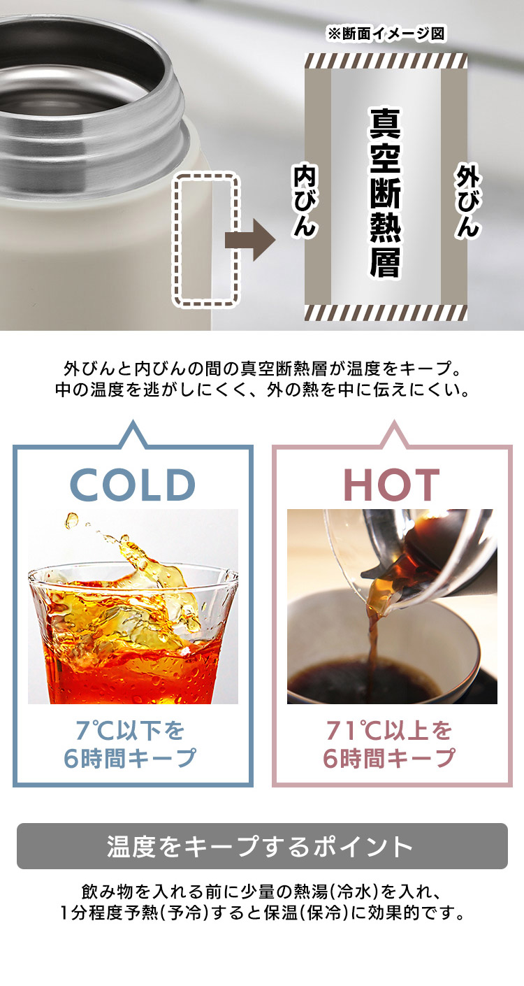 ※1 保温効力 室温20±2℃において、製品のせん下端まで熱湯を満たし、縦置きにした状態で、湯温が95±1℃のときから6時間放置した場合におけるその湯の温度のことです。