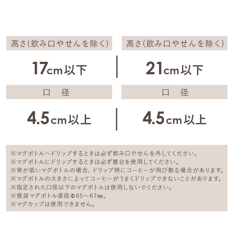 ※背が低いマグボトルの場合、ドリップ時にコーヒーが飛び散る場合があります。