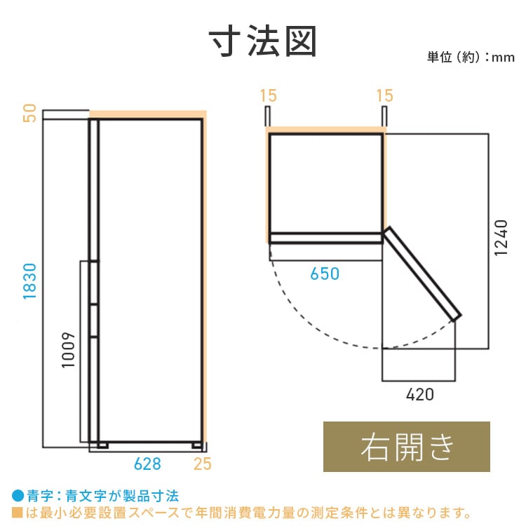 右側はドアが開くようにスペースを5cm以上取ってください。